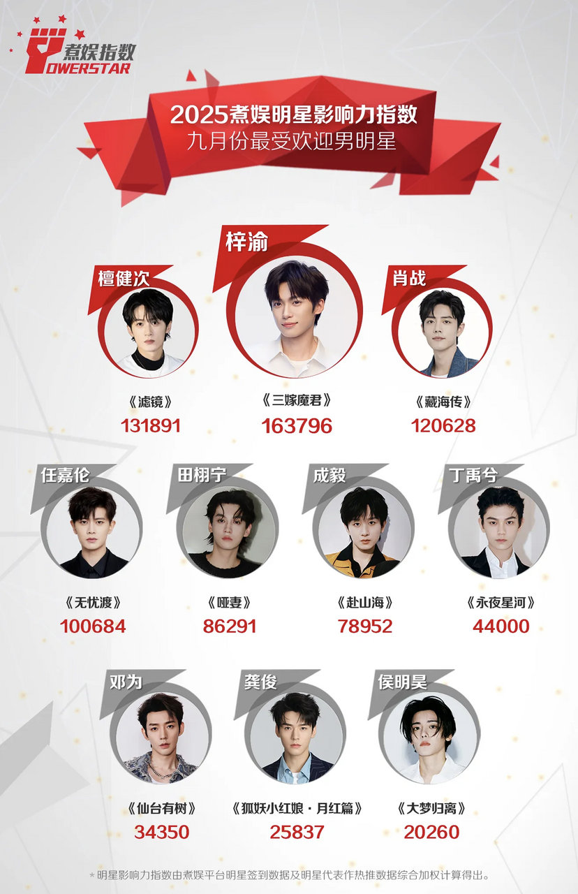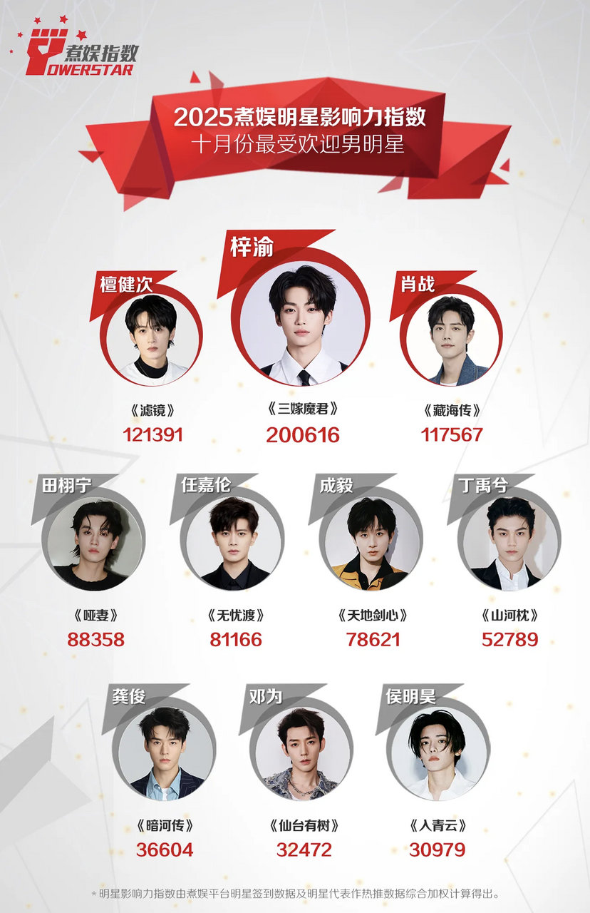 梓渝数据持续走高,蝉联十月煮娱影响力指数最受欢迎男明星