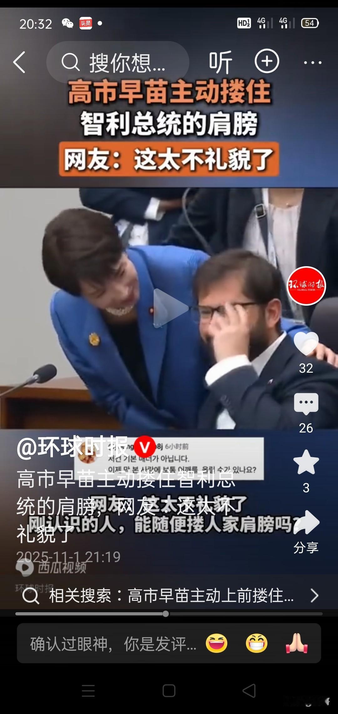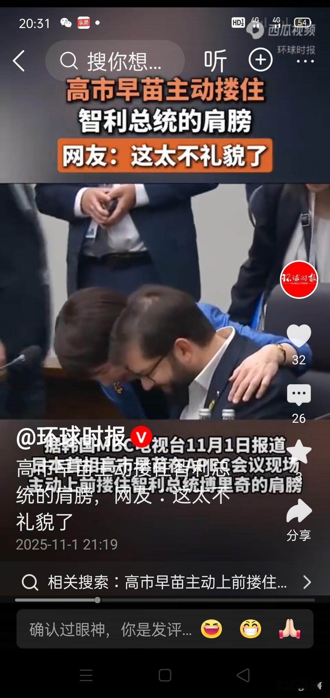 日本首相高市早苗,在正式场合举止轻佻,与他人勾肩搭背、搂搂抱抱,还挤眉弄眼、手舞足蹈,实在有失体统,甚至让智利总统都把眼镜摘了下来。 她与特朗普互动时更是极尽献媚、讨好之能事,此举遭到日本国内网友的强烈批评。 高市早苗这般言行举止,和有些低素质、刚上任的妇女主任有何差别?全然没有首相的样子。