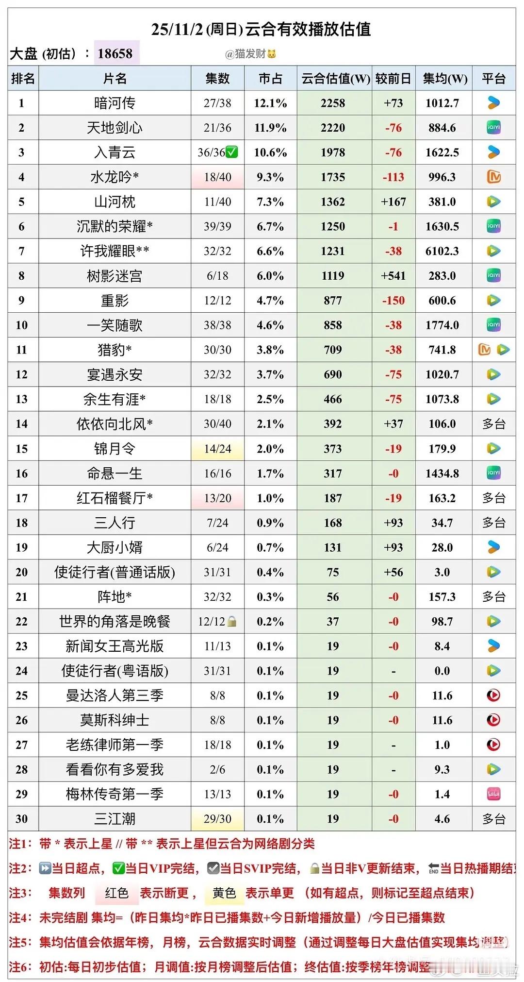 2025年11月01日云合长剧集正片有效播放量市占率TOP301天地剑心12