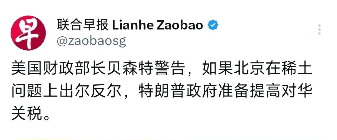 来自外媒11月3日消息说,美国财政部长贝森特警告称,如果他们在稀土问题上出尔反尔,特朗普政府准备提高关税。 事实上,贝森特这种说法,又是出来警告了,威胁了。只是这样有用吗?美国叫嚷着要加关税。只是关税并不是万能的,也解决不了任何问题。 我们已经用事实证明,对于当前这种情况,我个根本不会担心的。美国的关税大棒我们早就不怕了。