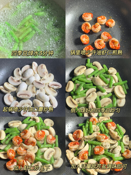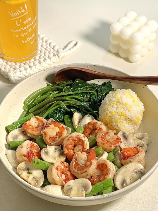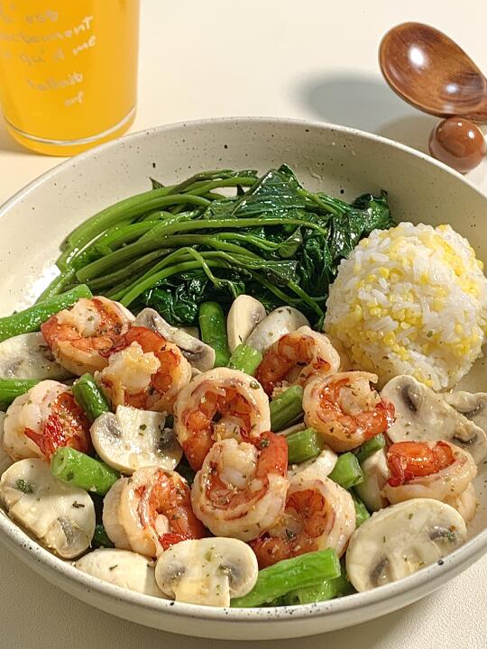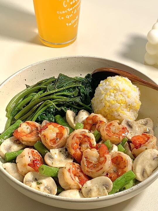 今日减脂餐口蘑炒虾仁!巨鲜美😋 📝食材:口蘑、虾仁、番薯叶、一拳头玉米饭 ✨做法: 四季豆焯水3分钟 锅里喷少许油虾仁煎熟 起锅把口蘑煎一下 加入四季豆炒匀 倒入虾仁炒匀 最后适量鸡精和欧芹盐调味即可出锅啦~