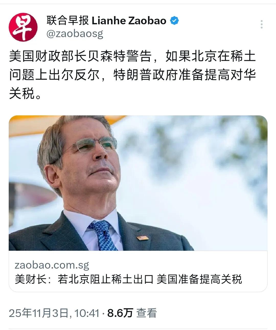 新加坡联合早报今天(11月3日)报道:“美国财政部长贝森特警告,如果北京在稀土问题上出尔反尔,特朗普政府准备对华提高关税。” 如果关税能解决稀土等关键矿产问题,贝森特就不会死乞白赖的要求谈判;如果关税能使美国财政状况好转,美国也就不会出现政府关门已超过34天,美国的国债数额已突破38万亿美元。贝森特曾信誓旦旦向特朗普保证,对华关税战美国一定会赢!因为中国输美产品数额大于美国,结果又是如何?为什么一掐脖子就翻白眼?