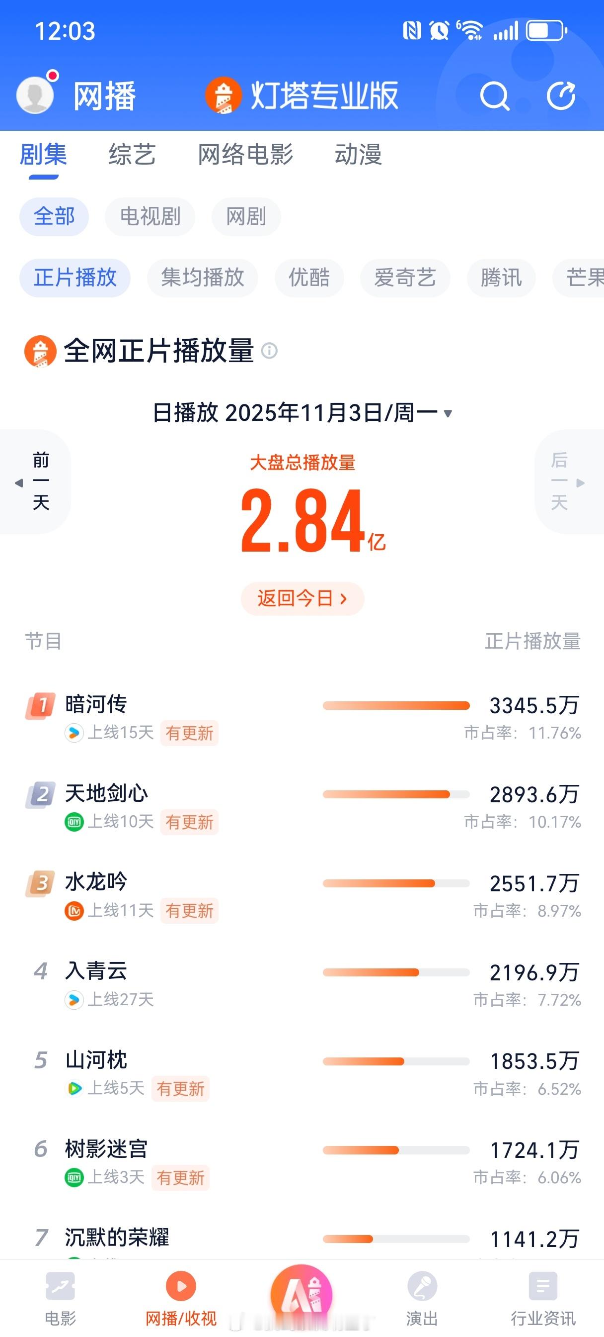 龚俊《暗河传》11.3灯塔数据持续登顶中,今天周一单更,相较上周单更日的数据来说拉升很可观,口碑持续发酵后观众还在进场,越来越好了[打call][打call][打call]