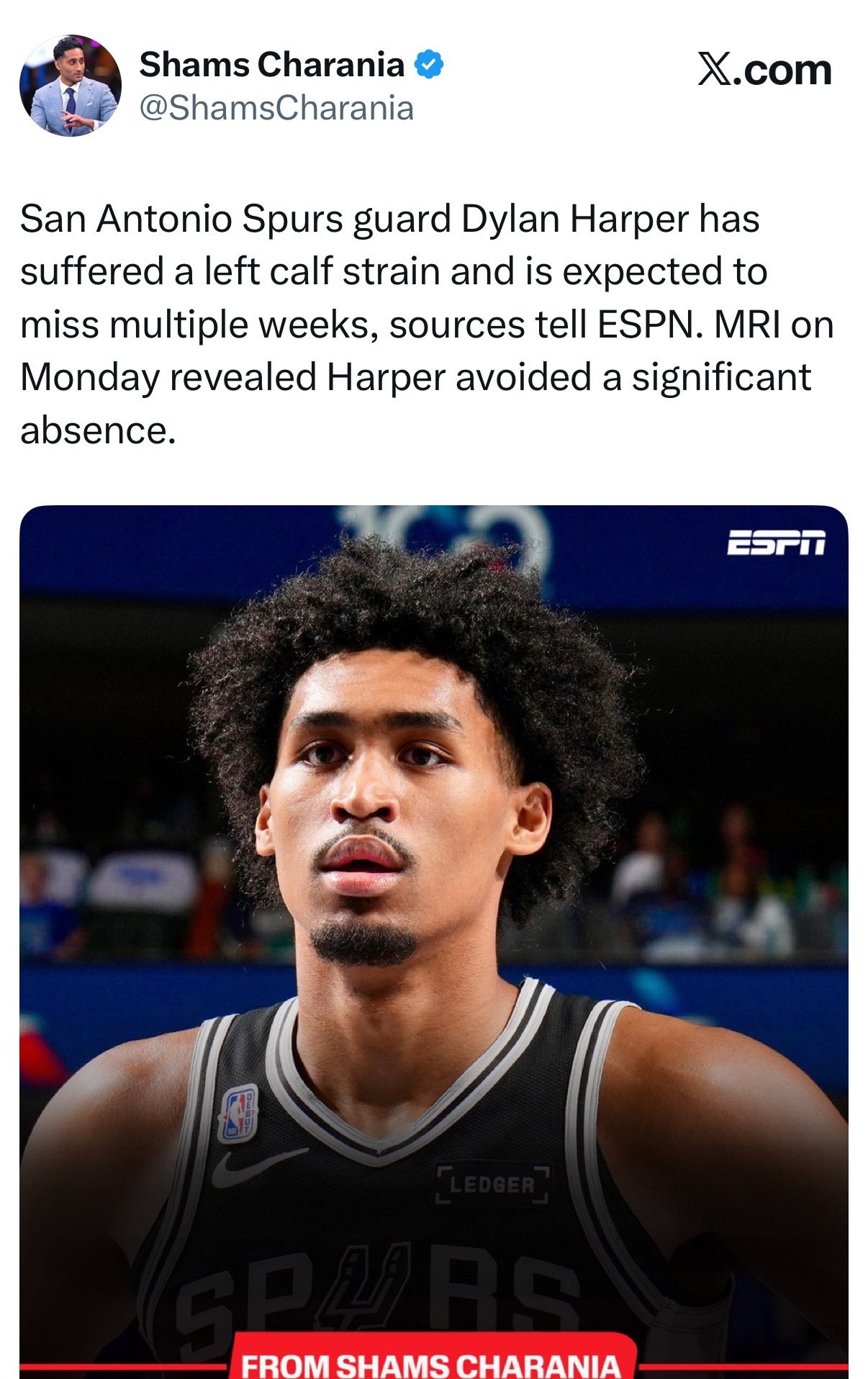 shams:迪伦·哈珀左小腿拉伤,预计将缺席数周。核磁共振显示,哈珀避免了更严重、长期的伤情缺席。