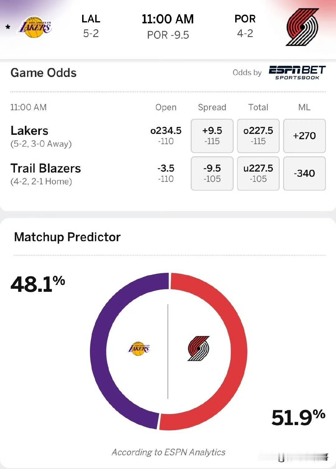 没戏了,再次被看衰!!!湖人胜率提升,开拓者主场从-3.5到-9.5! 就在刚
