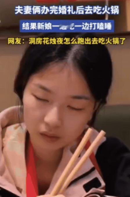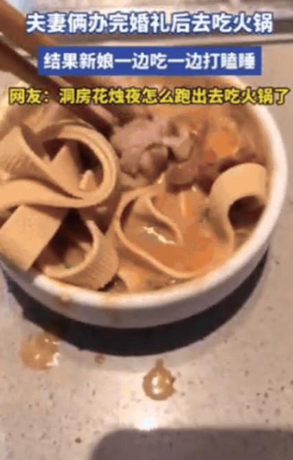 笑不活!江苏一对夫妻办完婚礼,新娘说没吃饱,2人竟然不急着入洞房,反而加餐吃火锅,结果,新娘一边吃一边打瞌睡,没一会儿就睡着了!手中的筷子还插在碗里,反观新郎,在旁边吃得老开心了!网友:洞房花烛夜怎么跑出去吃火锅了? 10月31日,婚礼当天,小两口从早上五点就开始忙,化妆、接亲、拜堂、敬酒,一整天下来连口热饭都没好好吃。 尤其是新娘,穿着厚重的婚纱,忙着和宾客合影、敬酒,到了晚宴环节,刚坐下吃了两口菜,就又被拉去敬酒,等送走最后一批客人,已经是晚上十点多了。 回到新房后,新娘卸下头饰、换了便服,第一句话就是 “我好饿啊,刚才根本没吃饱”。 新郎自己也饿坏了,两人对视一眼,没多想就决定 “出去吃点东西”。本来想随便找个小吃摊对付一下,可路过常去的火锅店时,闻到里面的香味,两人瞬间走不动道了,干脆直接推门进去。 两人点了满满一桌子菜,毛肚、鸭肠、肥牛、虾滑,全是平时爱吃的。锅底刚烧开,新娘就迫不及待地夹了一筷子毛肚,烫熟后塞进嘴里,满足地叹了口气:“终于吃到正经饭了!” 可毕竟忙了一整天,新娘的困意来得比食欲还快。 吃了大概半小时,她的眼皮就开始打架,夹菜的动作也慢了下来,最后干脆趴在桌子上,头靠着胳膊,没一会儿就发出了轻微的鼾声。 新郎发现后,哭笑不得地拍了张照片,照片里新娘的头发有点乱,手里的筷子还插在碗里,模样又可爱又好笑。 新郎没叫醒她,而是慢慢吃完了剩下的菜,结完账后,小心翼翼地把新娘扶起来,打车回了家。 第二天,新郎把照片发给朋友,还配文 “新婚夜,新娘在火锅店睡着了,我一个人吃完了所有菜”,朋友觉得特别有意思,就把照片和故事发在了网上,没想到一下子就火了。 网友们的评论快把评论区淹没了。 有人说:“这才是真实的婚姻啊,没有那么多浪漫套路,饿了就吃,困了就睡,太接地气了。” 还有人调侃:“新郎是不是故意的,知道新娘困,还拉着去吃火锅,好自己独享美食。” 甚至有刚办过婚礼的网友留言:“太懂这种感受了!我结婚那天也没吃饱,晚上和老公偷偷点了外卖,感觉比婚礼上的菜还香。” 面对网友的调侃,新郎笑着回应:“其实就是觉得,结婚最重要的是两个人开心,没必要非得按别人的想法来。她没吃饱,我就陪她去吃,她困了,我就等她睡醒,这些比所谓的‘新婚夜仪式’重要多了。” 新娘也说:“现在看到那张照片,还是觉得很好笑,这会是我们一辈子的回忆。” 这场充满烟火气的新婚夜,之所以能打动这么多人,或许就是因为它的真实。 不是所有的新婚夜都要浪漫到极致,有时候,一顿热乎的火锅,一次互相包容的陪伴,比任何华丽的仪式都更能体现婚姻的本质 —— 两个人在一起,就是要把日子过得有滋有味,简单又快乐。