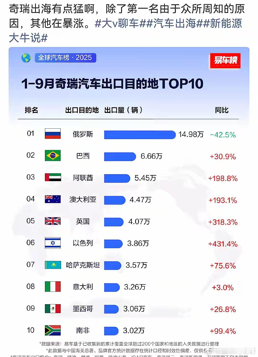 吴佩:奇瑞出海有点猛啊,除了第一名由于众所周知的原因,其他在暴涨!