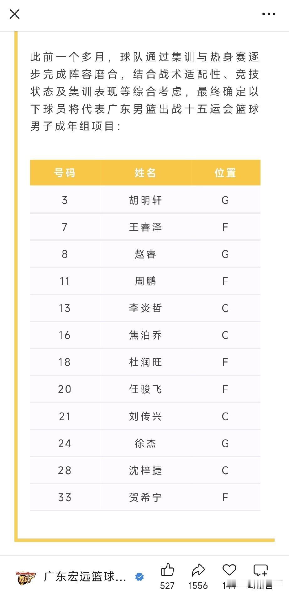 广东全运男篮最终12人大名单出炉,全员国家队级别+三张落选,这个名单你满意吗? 具体12人为:徐杰、胡明轩、赵睿、贺希宁、王睿泽、周鹏、杜润旺、任骏飞、焦泊乔、李炎哲、沈梓捷、刘传兴。 这12人里,全员都入选中国男篮国家队,可谓星光熠熠。 而此前跟随广东队打热身赛,并表现出色的张文逸和张昊,落选了此次的大名单,张皓嘉和一直没跟队的黎伊杨,也同样落选了。 就是不知道这个12人大名单,是否可以每场更换的?