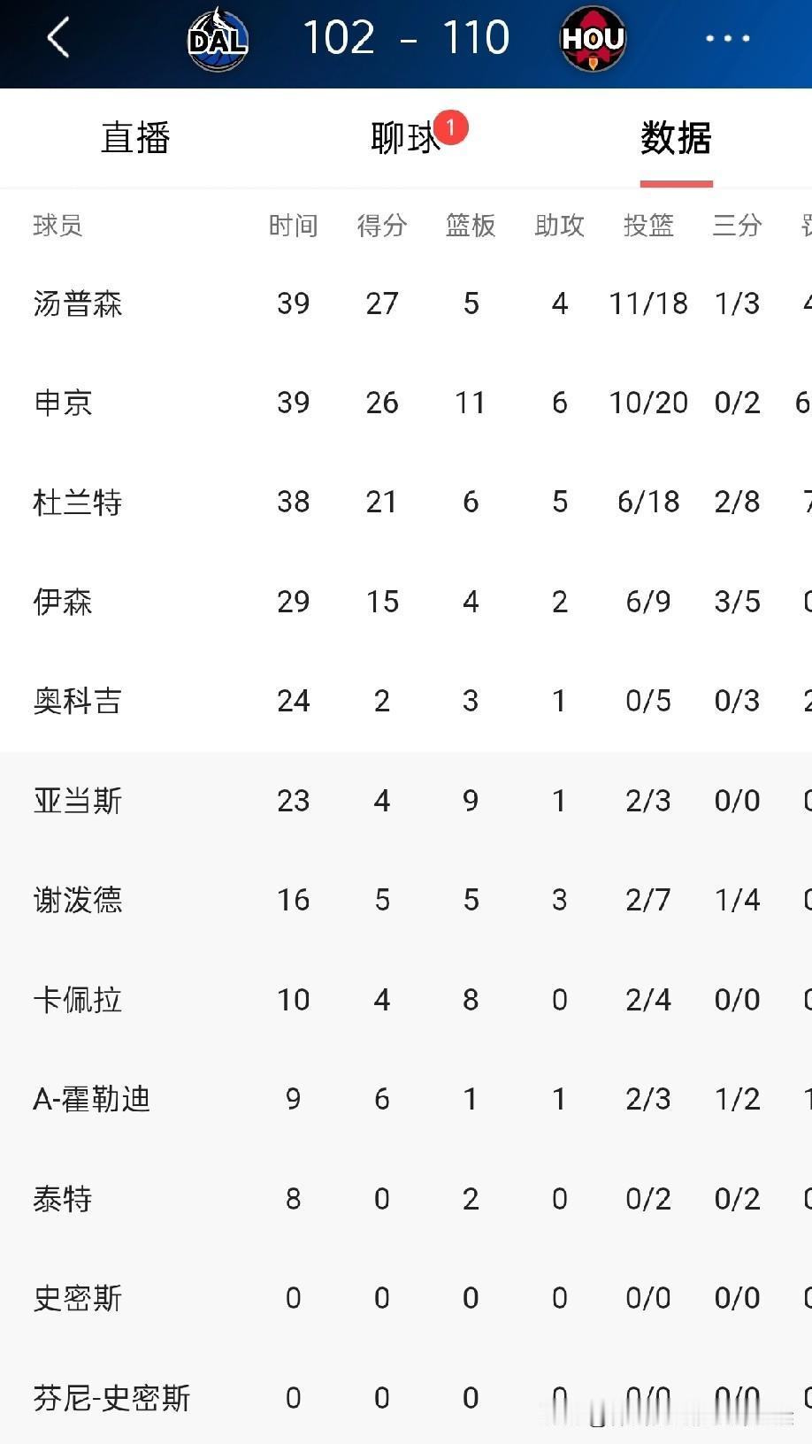 火箭110-102战胜独行侠,本场比赛阿门汤普森与塔里伊森高效输出带领火箭拿下四