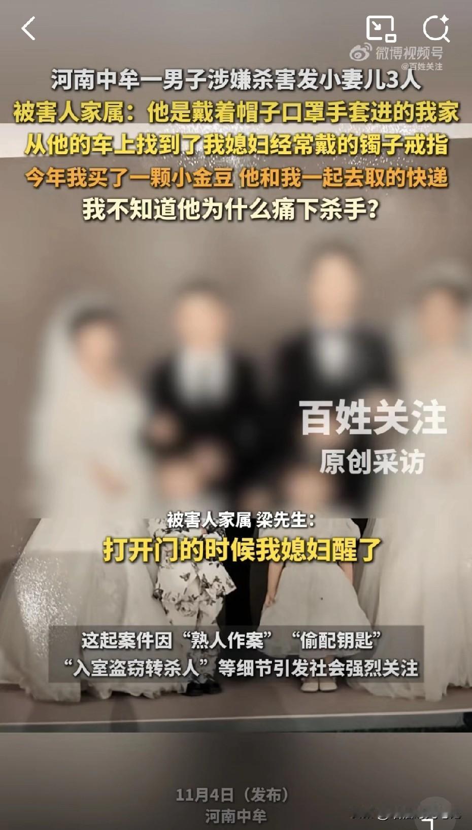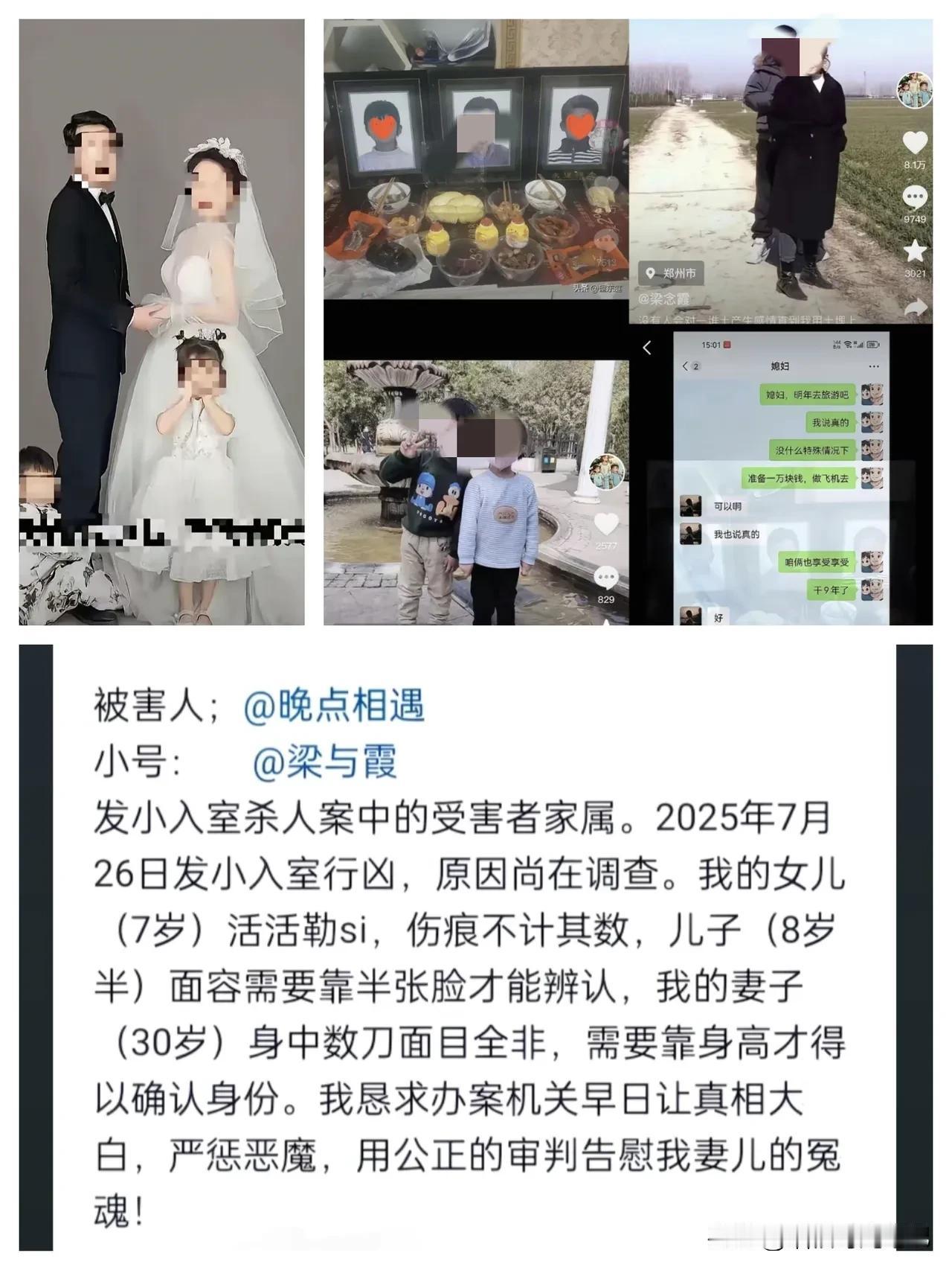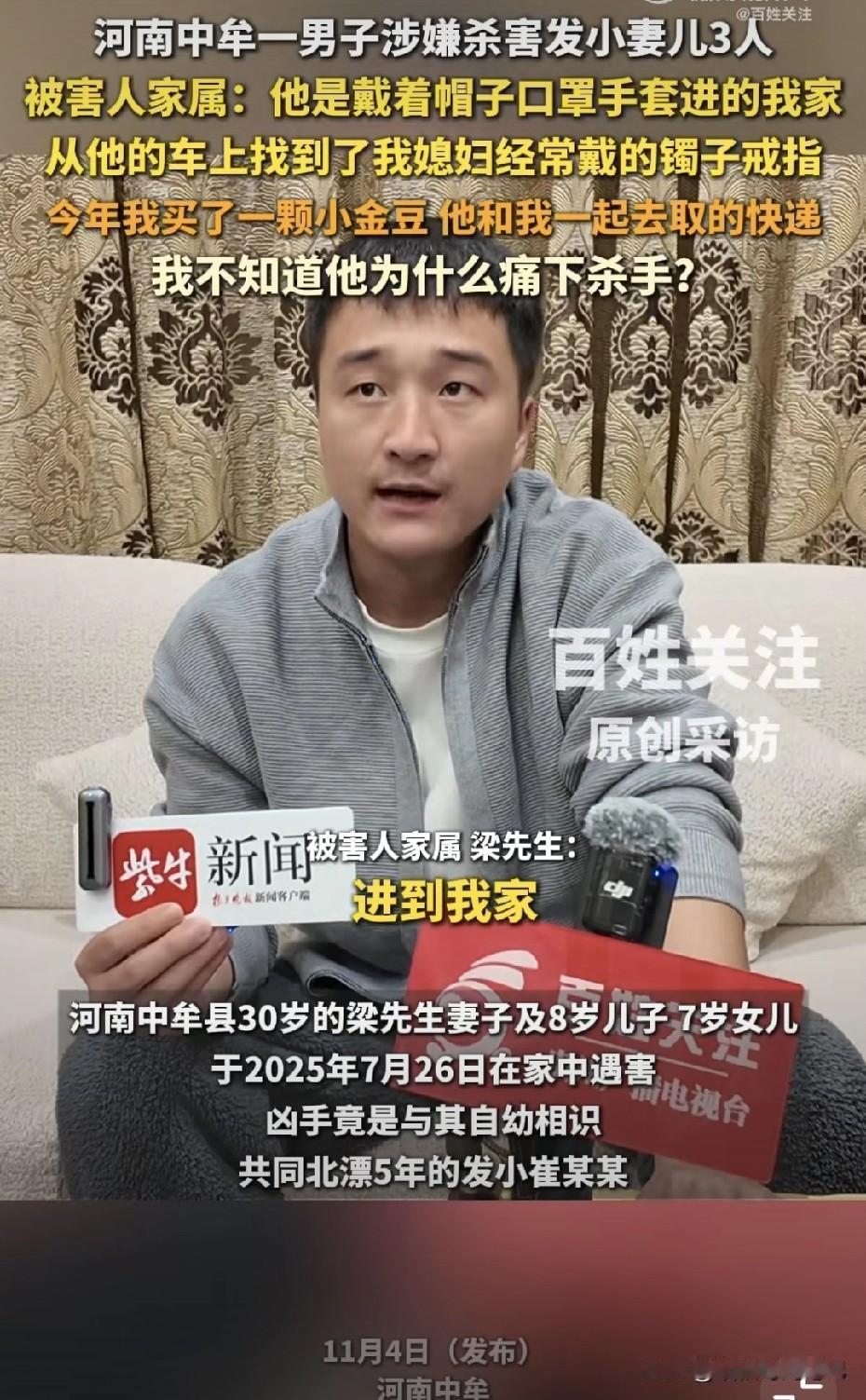 发小变“恶魔”!妻儿三人惨遭毒手,男子痛哭:“我让他去我家看看,他嘴上答应,结果转身就杀了我老婆孩子!”河南郑州中牟的梁先生,怎么也没想到,自己托付的发小,竟是夺走他一家三口性命的凶手。 7月26日,一个普通得不能再普通的夏日。梁先生像往常一样,早上五点,梁先生惯例给妻子发“媳妇早安,又是想你的一天”。 可这条消息,却再也没收到回复。 从早上到下午,妻子失联,电话不接、微信不回。梁先生心慌得喘不过气,只好拜托“最信得过”的发小崔某某去家里看看,对方满口答应,却一拖再拖,还劝他“别麻烦老人”。直到晚上,梁先生让岳父岳母赶去家里, “人没了!仨都没了!” 30岁的媳妇、8岁半的儿子、还差几天过7岁生日的小棉袄,全倒在血泊里,面部被毁,只能靠身高和儿子的半张脸猜。 而警方锁定的嫌疑人,正是那位“发小”——26岁的崔某某。 梁先生怎么也不敢相信: “他脖子上有抓痕,我老婆指甲里有他的DNA。”梁先生哽咽着说。更细思极恐的是,崔某某早就偷偷配了他家的钥匙,案发当天潜入家中,作案后还顺走了黄金首饰和银行卡。 为了掩盖罪行,他甚至把现场打扫得干干净净,空调开到16度,试图延缓尸体腐败。事后还装模作样赶到案发现场,打电话问“嫂子手机开机密码多少”,企图解锁销赃。 “他来我家吃过无数次饭,我老婆还给他做过晚饭,他怎么下得去手?”梁先生想不通,那个曾经一起北漂、过年一起喝酒的“兄弟”,怎么会变成冷血的杀人恶魔? 崔父面对媒体直接甩话:“我当没生这儿子,一分律师费不出,该死死!” 如今,案件仍在侦办中,梁先生夜夜靠白酒才能睡两个小时,体重掉了20斤。梁先生只有一个诉求:“我要他偿命,还我妻儿一个公道!” 知人知面不知心!防人之心不可无!最好别带朋友去家玩!有些人就是恨你有笑你无! 朋友们, 你身边有没有“看似铁瓷、实则坑你”的老同学?借钱给亲友,你设过底线吗? [图源网络]