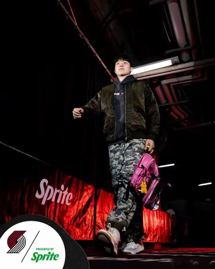 赛前,开拓者官方分享球员入场穿搭,杨瀚森上身夹克套卫衣,下面穿着一条迷彩裤,手里依然拿着自己的粉色小书包。