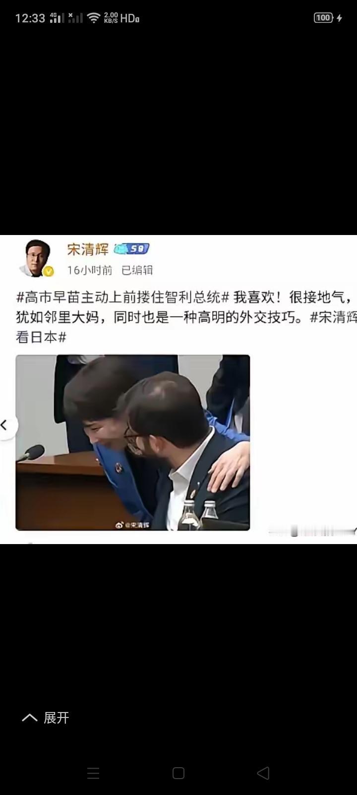 一国首相与他国总统公共场合勾肩搭背,就叫接地气?问题是她一个女的公共场合搂一陌生男人就属于外交技巧?别污辱邻家大妈了,正经大妈没有公共场合与陌生男人勾肩搭背的,换作是你媳妇你愿意吗? 为什么正常人不讨厌的行为在宋某眼中就是“外交技巧”?就是“接地气”行为?为什么中国人反对的日本极右翼分子,宋某就看着那么喜欢呢?