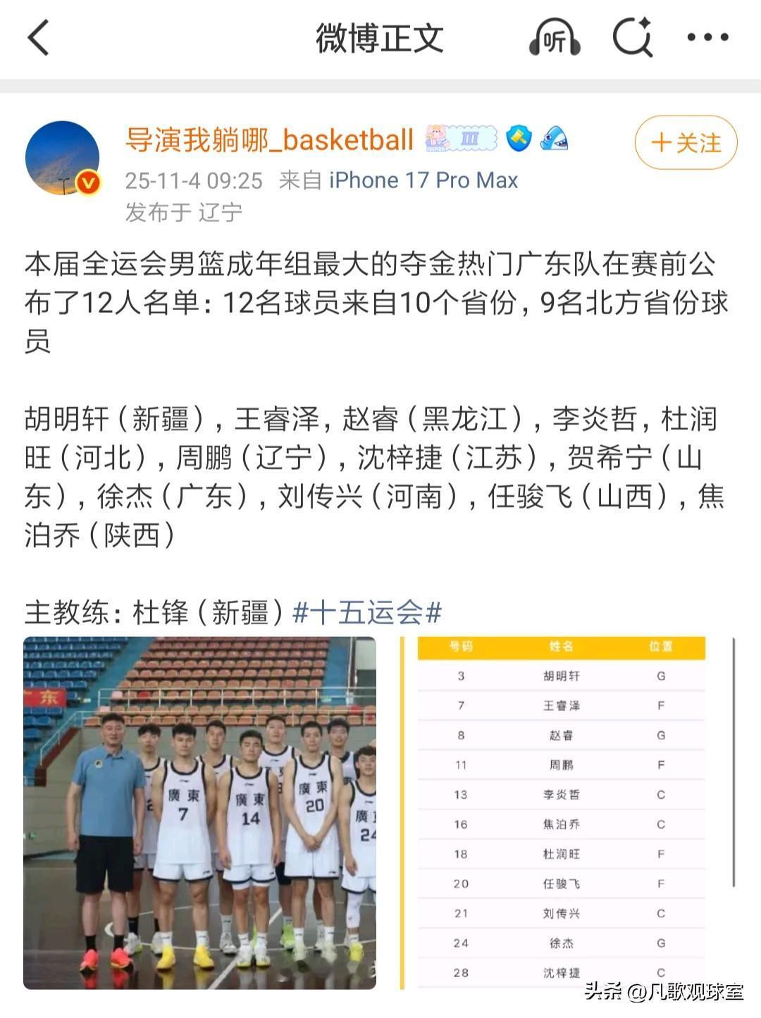 辽宁知名篮球媒体人:全运会男篮夺冠大热广东队的12名球员来自10个省,9名北方地区球员,只有徐杰是广东人,比辽宁队差远了,辽宁队都是土生土长的辽宁人,而且都是在辽篮俱乐部效力过的球员! 广东全运男篮纯属是雇佣兵而已,永远不及辽宁子弟兵有荣誉感和归属感,哪怕广东队夺冠了也不值得自豪和骄傲!