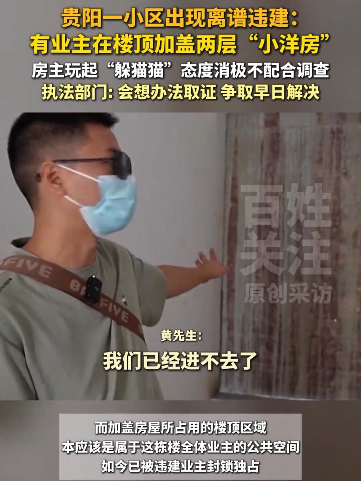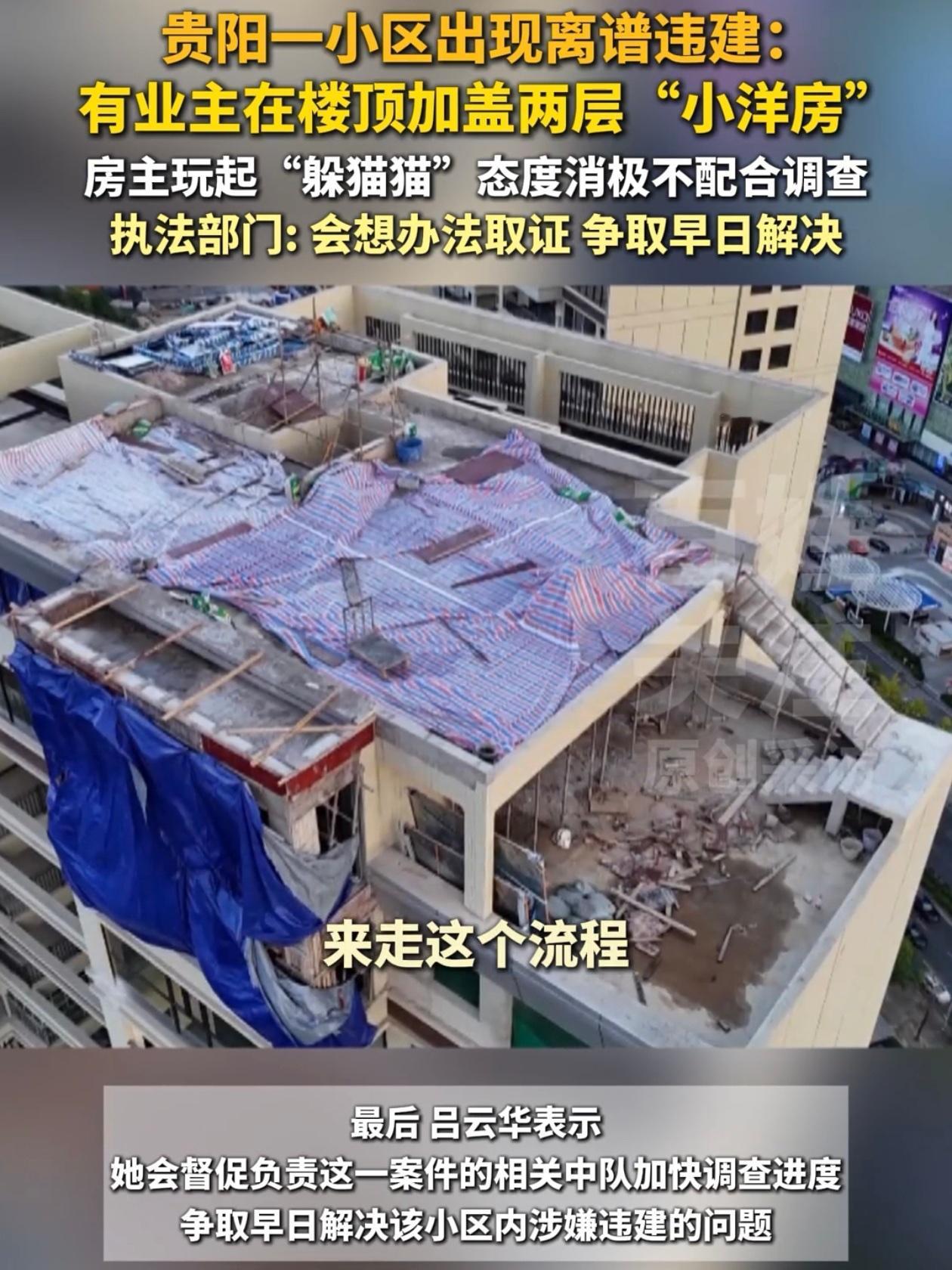 "太缺德了!"近日,贵州贵阳,小区业主们炸了锅,原因是顶楼住户竟然在楼顶违建了两层"空中别墅",把大家的公共区域当成自家后院了。 事情要从今年7月说起,那时候就有细心的业主发现楼顶不对劲,原本空荡荡的平台突然多出来一片建筑,还装上了落地窗,远远看去跟个小洋房似的。 一开始大家还以为是物业要盖个什么设施,结果一打听才知道,这是顶楼那户人家自己搞的,把本该属于全体业主的公共区域圈了一大块,硬生生盖起两层楼来。 这下邻居们可坐不住了,楼顶那块地方平时是大家晾晒衣服的地方,更重要的是它还是消防通道的一部分,万一真出了火情,消防车怎么上来?救援人员怎么展开工作? 有业主专门跑到楼顶看了看,发现这"小洋房"占地足足有四五十平米,不仅砌了墙、装了门窗,里面还隔出了好几个房间,电线、水管一应俱全,分明是打算当正经房子用。 更气人的是,这户人家把楼梯口也给堵了一半,原本两米宽的通道现在只剩一米多,两个人并排走都费劲,要是真遇到紧急情况,这不是要人命吗? 邻居们联名去找物业反映,物业经理倒是挺重视,当天就打电话给那户业主,可对方接了电话直接来了句:"关你什么事?我自己家楼顶我爱怎么盖怎么盖。" 物业没辙,又组织了几个业主代表上门沟通,敲了半天门,里面传出来一句:"别敲了,烦死了,该干嘛干嘛去。"这态度把业主们气得够呛。 有个脾气急的业主当场就想报警,被其他人拦住了,说还是先走正规渠道,于是大家一起到城管部门举报。 城管接到举报后很快派人来了,工作人员现场拍照取证,测量了违建面积,确认这属于严重的违法建设,当即要求业主配合调查。 谁知这业主倒好,听说城管来了,躲得比兔子还快,打电话不接,敲门不开,城管只好把整改通知书贴在他家门上,按照程序算是送达了。 过了两天,这业主终于露面了,见到物业工作人员就甩出一句话:"城管让我拆我就拆,你们说了不算。"这话说得,好像除了城管谁都管不了他似的。 小区业主群里彻底炸了锅,有人气得直接发语音:"这人是真把自己当回事了,公共区域想占就占,违章建筑想盖就盖,法律在他眼里算什么?" 还有业主算了笔账:"他买顶楼的时候房价比中间层便宜好几万,结果转头就把省下来的钱赚回来了,这一违建相当于白送他两层楼,我们这些遵纪守法的人成傻子了?" 更有懂行的业主指出:"最可怕的不是占便宜,是消防隐患,咱们这栋楼住了一百多户人,真要出事儿,他这违建就是夺命关口。" 社区工作人员也多次上门劝说,苦口婆心地讲道理、说利害,可这业主就是油盐不进,有一次甚至当着工作人员的面说:"我就住在这儿了,你们能把我怎么样?" 城管部门后来下了限期拆除通知书,给了15天整改期,可期限到了,那"小洋房"依然岿然不动,业主继续我行我素。 无奈之下,相关部门只能启动强制执行程序,可这需要走法律流程,从取证到立案再到执行,少说也得两三个月,这期间那违建就一直杵在那儿。 网友们看了这事儿也是气不打一处来,有人留言:"这种人就是欠收拾,罚他个倾家荡产,看他还敢不敢嘚瑟。" 还有人建议:"直接断他水电啊,看他还怎么住,不配合就别想享受小区的任何服务。" 更有法律从业者科普:"违章建筑不受法律保护,强拆后不仅没有赔偿,还要承担拆除费用,到时候哭都来不及。" 老话讲"勿以恶小而为之",占公共便宜看着是小事,可积累起来就是大毒瘤,今天你占一块,明天他圈一片,小区还能要吗? 这或许就是规则的意义吧,不是用来约束老实人的,是用来制裁那些不把规矩当回事的人,你可以装聋作哑,但法律的铁锤早晚会落下来,到那时后悔也晚了。