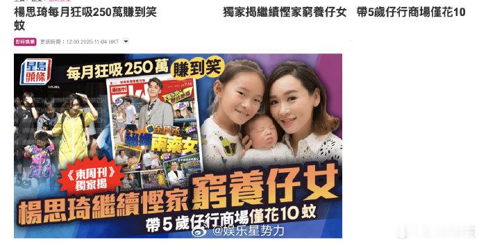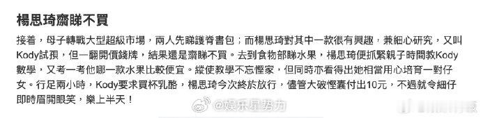 港媒称杨思琦带娃两小时仅花10元 据港媒,2001年港姐冠军杨思琦独自带着 5 岁的小儿子 Kody 现身尖沙咀商场,母子两人打扮十分朴素。进入商场后,Kody 一直拿起各种玩具,但杨思琦并未购买。