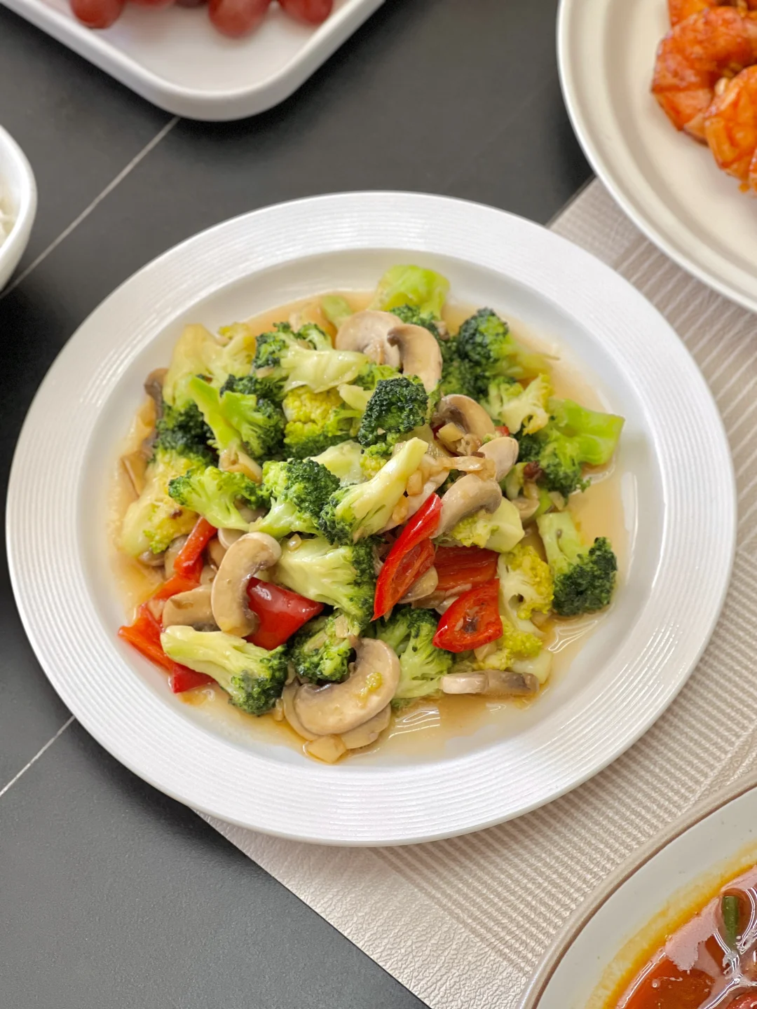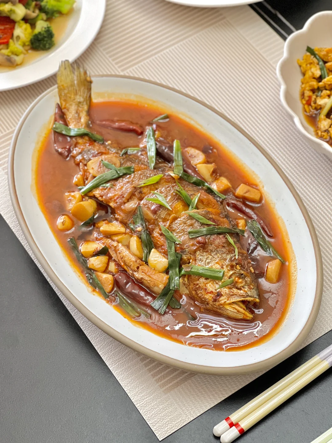 经常做家烧黄鱼,今天换个做法—红烧黄鱼,更适合口儿重的小伙伴们~油醋爆蛋可太下饭啦,我们俩吃这个菜分分钟光盘呀[派对R] 【红烧黄鱼】 【茄汁大虾】 【油醋爆蛋】 【西兰花炒口蘑】