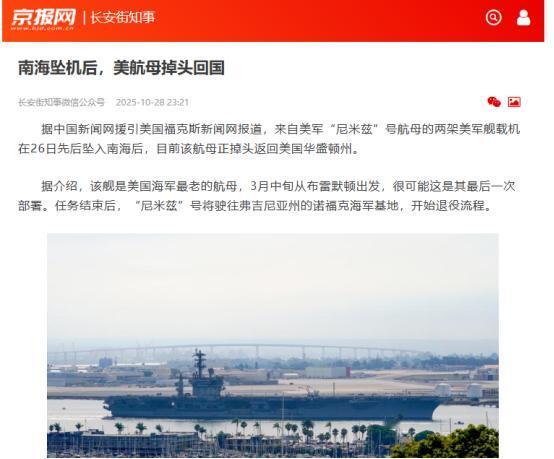 美航母战斗群逼近,距黄岩岛仅仅100英里,卫星照片显示中方不忍了! 最近南海不太平,一则卫星图像传来的消息让不少人绷紧了神经:美国海军“尼米兹”号航空母舰带着整整一个航母战斗群,已经开到了黄岩岛以南仅100英里的地方。 这个距离有多近?换算成公里也就一百六十多公里,相当于从市区到邻市的距离,对于航母战斗群这样的庞然大物来说,完全处于前沿部署的位置,其威慑意味不言而喻。 更值得注意的是,这次美军可不是单枪匹马,随行的护航舰队堪称豪华配置——“格里德利”号、“韦恩·E·迈耶”号、“莱娜·萨特克利夫·希格比”号三艘阿利·伯克级导弹驱逐舰。 再加上“普林斯顿”号导弹巡洋舰和疑似“菲茨杰拉德”号的另一艘伯克级驱逐舰,五艘护航舰艇围着“尼米兹”号,形成了一套完整的攻防体系,这阵仗显然是有备而来。 不过熟悉美军动态的人可能会发现,这支看似威风的航母战斗群,其实最近有点“流年不利”。 就在逼近黄岩岛之前的10月26日,“尼米兹”号上接连摔了两架舰载机,下午两点多一架MH-60R“海鹰”直升机坠海,不到半小时后又有一架F/A-18F“超级大黄蜂”战斗机掉了下去。 虽然机上人员都被救了上来,但短短几十分钟内连续发生坠机事故,足以说明这艘航母的战备状态可能并没那么光鲜。 更有意思的是,美军对坠机原因支支吾吾,至今没给出明确解释,而按照此前的消息,这艘已经服役几十年的老航母本就到了快退役的年纪,这次部署大概率是它最后一次执行任务,却偏偏选在南海搞这么大动作,难免让人觉得有“回光返照式秀肌肉”的嫌疑。 面对美军这种带着“伤痕”的挑衅,中方的反应可以说是意料之中的果断,所谓“不忍了”的说法,其实是对中国军队常态化维权行动的直观体现。 早在10月31日,中国人民解放军南部战区就已经明确发布消息,宣布组织海空兵力在黄岩岛领海领空及周边区域开展战备警巡,当时就强调了要“有效应对各类侵权挑衅”,显然早就预判到了周边海域可能出现的异动。 从时间线就能看出来,美军11月初逼近的举动,正好撞在了中方战备警巡的“枪口”上,这也让中方的应对显得从容不迫,完全不是临时仓促反应。 可能有人会问,中方到底有哪些动作?虽然没有像美军那样刻意张扬,但从现有信息就能拼凑出立体防御的全貌。 首先是侦察预警层面,中国的海洋监视卫星网络早就实现了对西太平洋重点海域的持续覆盖,再加上黄岩岛周边岛礁部署的米波雷达和空警-500预警机。 从太空到低空织成了一张“天罗地网”,“尼米兹”号从进入南海开始,它的航行动向、编队构成甚至战术意图,大概率都在中方的全程掌握之中。这种“单向透明”的信息优势,正是主场作战最核心的底气所在。 在实际部署上,虽然有自媒体宣称看到055型驱逐舰穿插美航母编队,但根据国外军事网站的研判,由于卫星照片分辨率限制,暂时没法准确判断那些大型舰艇是055大驱还是美军自己的巡洋舰——毕竟两者长度相仿。 不过即便没有明确的055身影,中方的海空力量也绝不会缺位。南部战区的驱逐舰、护卫舰编队常年在南海战备巡逻,加上从岛礁机场起飞的歼击机、轰炸机,形成了“舰机协同”的立体防控体系,美军航母战斗群的一举一动都在我方兵力的抵近监视之下。这种“你敢来,我就敢盯”的态势,比单纯的舰艇对峙更有威慑力。 更值得玩味的是美军此次行动的矛盾性。就在不久前,中美刚在釜山举行峰会达成不少共识,美方嘴上说着“不寻求冲突”,转头就派航母逼近黄岩岛,这种“说一套做一套”的操作,彻底暴露了其对华政策的两面性。 一方面想通过经济合作捞取好处,另一方面又不愿放弃遏制中国的战略冲动,试图通过“切香肠”式的挑衅试探中方底线。 更讽刺的是,美军还拉着盟友搞所谓“联合巡航”,宣称要维护“航行自由”,但这次“尼米兹”号的拙劣表现——先摔两架飞机再匆匆逼近——反而让周边国家看清了其“外强中干”的本质。 其实明眼人都能看出来,美军在南海根本不占优势。中方在永暑、美济、渚碧三大岛礁建成的“不沉堡垒”,配备了机场、雷达站和弹药库,为海空力量提供了稳固的前沿支点。 岛链内密集的侦察预警设施,构建起层层递进的“近海防御圈”;再加上055大驱、航母编队等现代化装备的不断列装,中国已经在南海构建起一套成熟的“区域拒止体系”。 反观美军,“尼米兹”号远离本土补给线漫长,刚发生坠机事故又仓促挑衅,连基本的战备稳定性都保证不了,所谓的“威慑”更像是自欺欺人。 说到底,美军这次派航母逼近黄岩岛,看似来势汹汹,实则是“黔驴技穷”的表现。贸易战没占到便宜,技术封锁没能遏制中国发展,就想靠军事威慑来找回面子,却忘了黄岩岛是中国固有领土,在自家门口捍卫主权,中方有的是底气和手段。