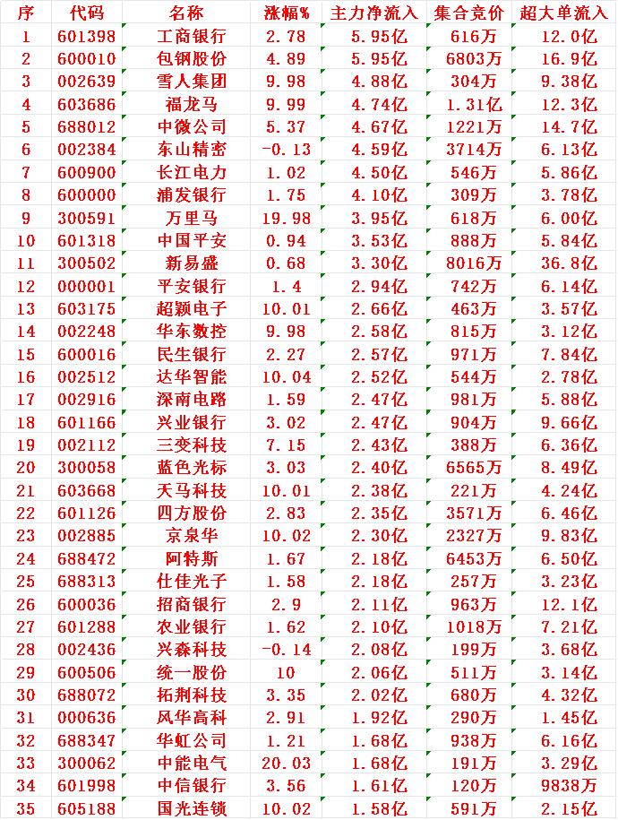11月4日收盘,主力趁冲高,已经大幅卖出的35名单: 阳光电源:净流出 15.8亿元,超大单流入 50.3亿元 三花智控:净流出 13.3亿元,超大单流入 11.8亿元 常山药业:净流出 11.7亿元,超大单流入 8.01亿元 亿纬锂能:净流出 11.1亿元,超大单流入 5.63亿元 工业富联:净流出 10.5亿元,超大单流入 17.7亿元 宁德时代:净流出 9.59亿元,超大单流入 13.2亿元 比亚迪:净流出 9.49亿元,超大单流入 4.28亿元 中兴通讯:净流出 9.49亿元,超大单流入 11.5亿元 11月4日收盘,主力资金“大幅买入”的35强: 工商银行:净流入 5.95亿元 包钢股份:净流入 5.95亿元 雪人集团:净流入 4.88亿元 福龙马:净流入 4.74亿元 中微公司:净流入 4.67亿元 东山精密:净流入 4.59亿元 长江电力:净流入 4.50亿元 浦发银行:净流入 4.10亿元 万里马:净流入 3.95亿元 中国平安:净流入 3.53亿元 新易盛:净流入 3.30亿元 平安银行:净流入 2.94亿元 超颖电子:净流入 2.66亿元 华东数控:净流入 2.58亿元 民生银行:净流入 2.57亿元