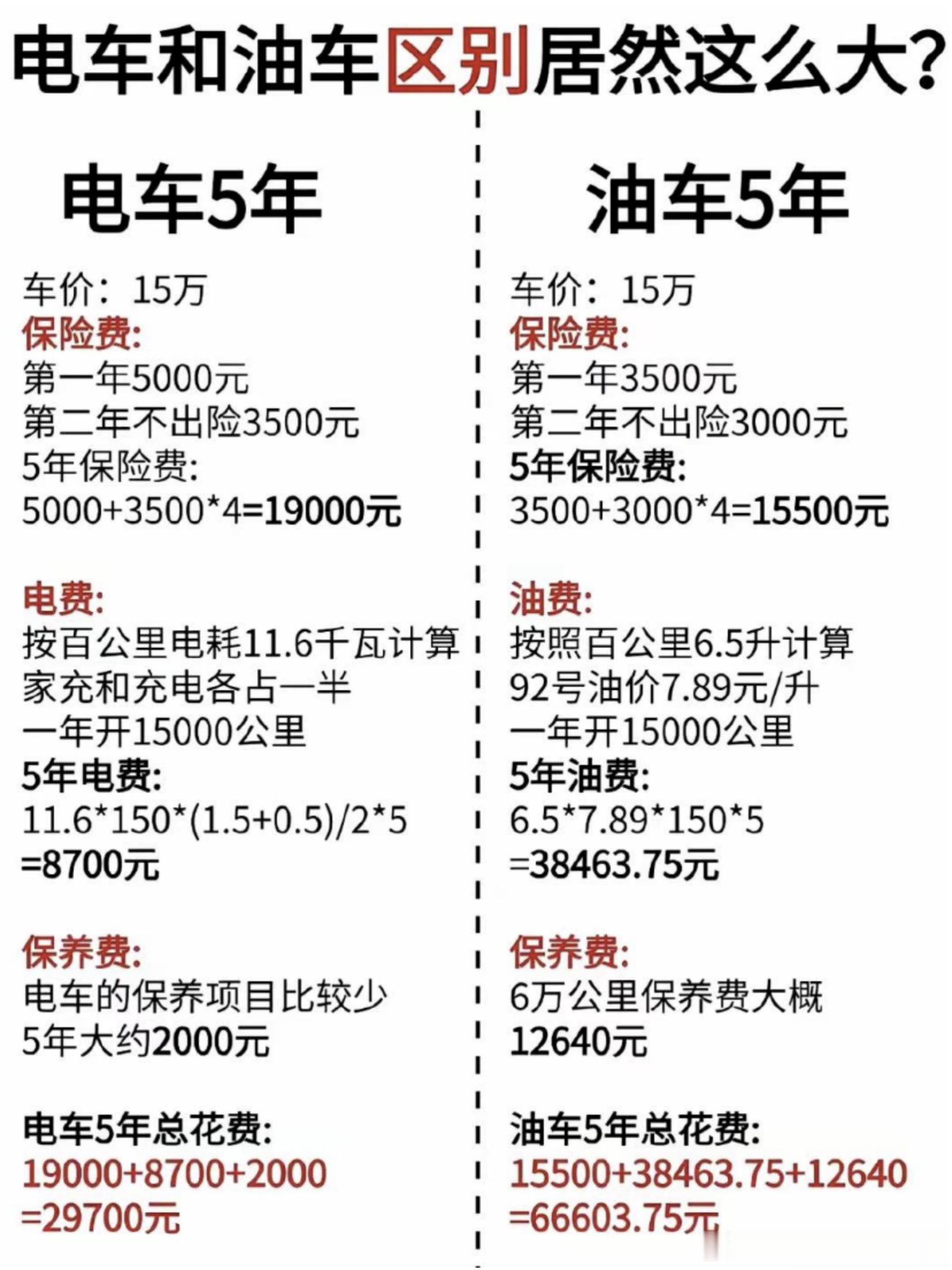 最近,小编在车友圈看到有圈友计算了油车和电车5年花费的对比图,两者开销相差近4万元,主要拉开差距的地方在于电费和保养费用,电车5年总花费在29700元,而油车则高达66603.75元。