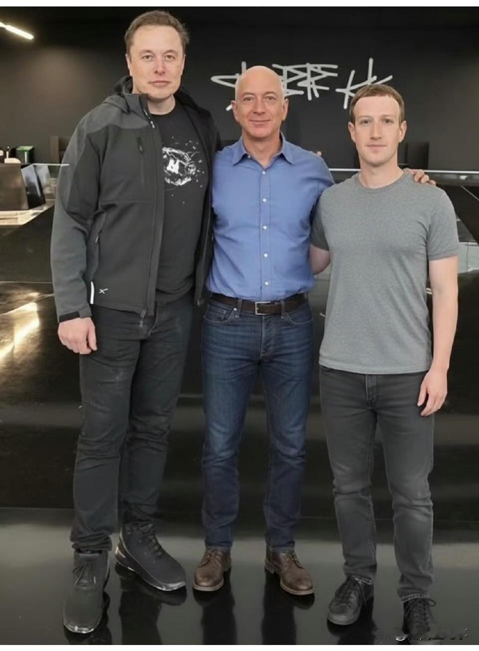 美国 Ai 三巨头的合影,马斯克的个子是最高的,也是最壮的,非洲白人移民的体格真不是盖的。扎克伯格个子最矮。贝佐斯看起来矮小,实际上个头并不小,雷军如果和他们并排,这画面就不敢想象了。