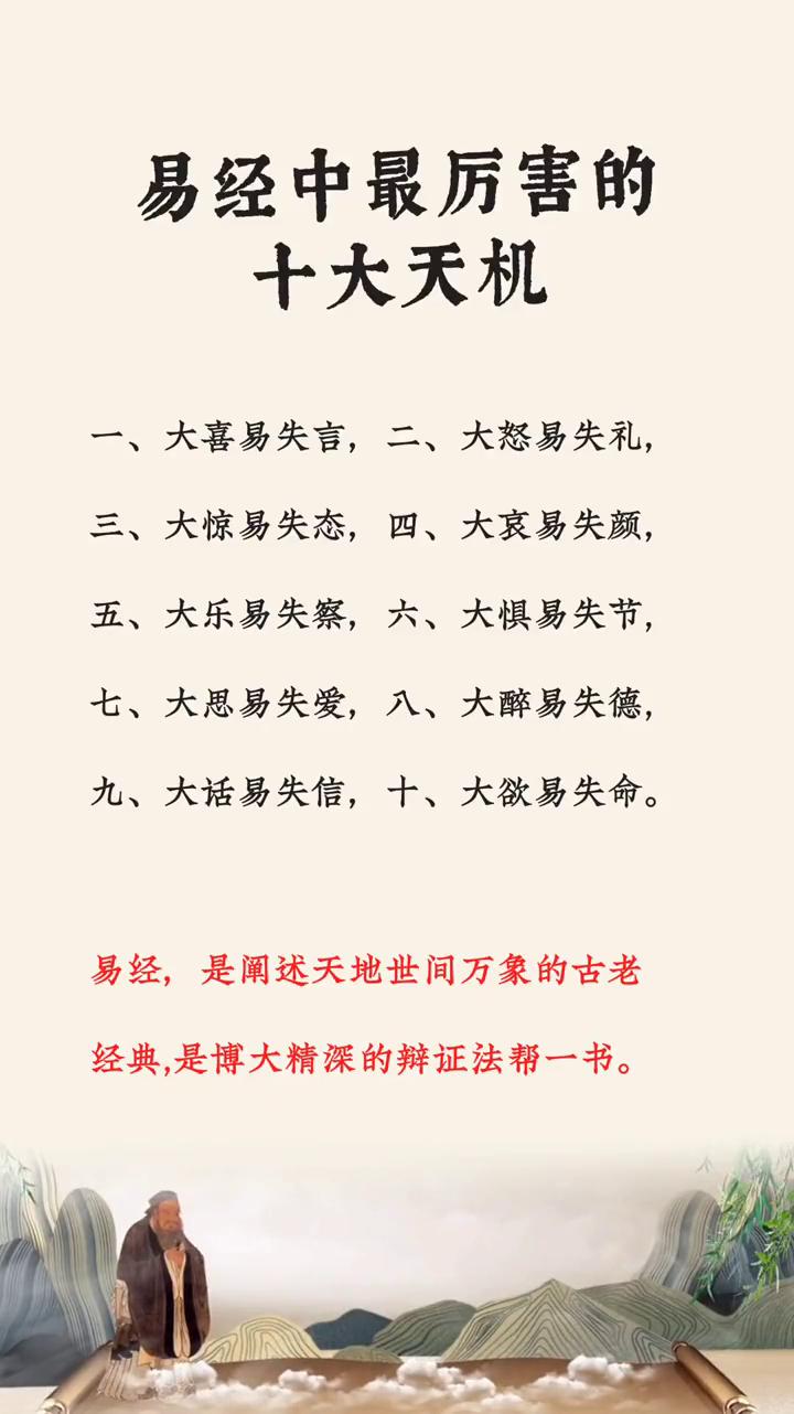 易经中最厉害的十大天机。 ·一、大喜易失言。 ·二、大怒易失礼。 ·三、大惊易失态。 ·四、大哀易失颜。 ·五、大乐易失察。 ·六、大惧易失节。 ·七、大思易失爱。 ·八、大醉易失德。 ·九、大话易失信。 ·十、大欲易失命。 易经是阐述天地世间万象的古老经典,是博大精深的辩证法帮一书。