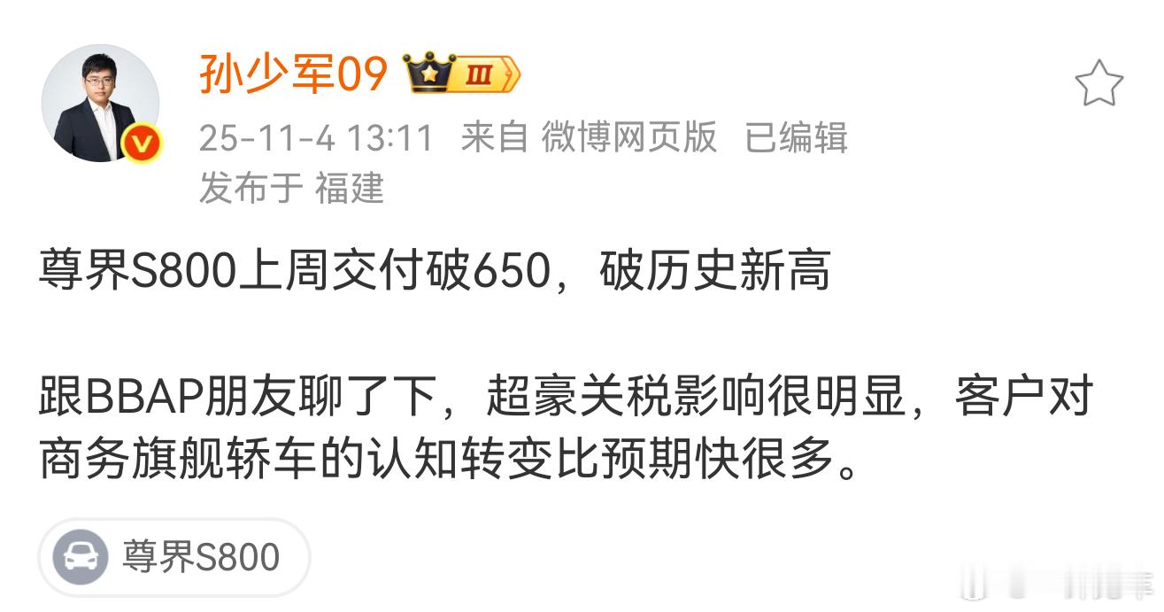 尊界S800交付又破新高。之前也跟业内人士聊过,超豪关税对保时捷的影响尤其明显,因为部分主销车型价位正好卡着原本的豪车税界限。客户一看突然要多交这么多税,就更倾向于去了解其他车型了。尊界不试不知道,试过基本上就很难“移情别恋”了[doge]