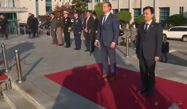 赫格塞斯访韩,开局就把“仪式感”拉到满——坐着敞篷车跟安圭伯一起检阅仪仗队,军乐队奏乐、士兵正步走,俩人身后是齐刷刷的敬礼,活像给这场安全会谈先办了场“正式开场秀”。 第二天的韩美安全会更像“同盟事务研讨会”,从应对朝鲜威胁到太空、网络合作,议题一条接一条,连“不随便调驻韩美军”“加快交战时指挥权”这种实在事都聊透了,没半点虚的。中途俩人还跑去板门店非军事区“实地考察”,站在分界附近听情况,算是给“同盟铁关系”拍了张“现场合影”。最后那场F-16联合飞行更绝,战机编队低空掠过,引擎声嗡嗡响,不知道的还以为是给会谈成果放了段“硬核背景音”。