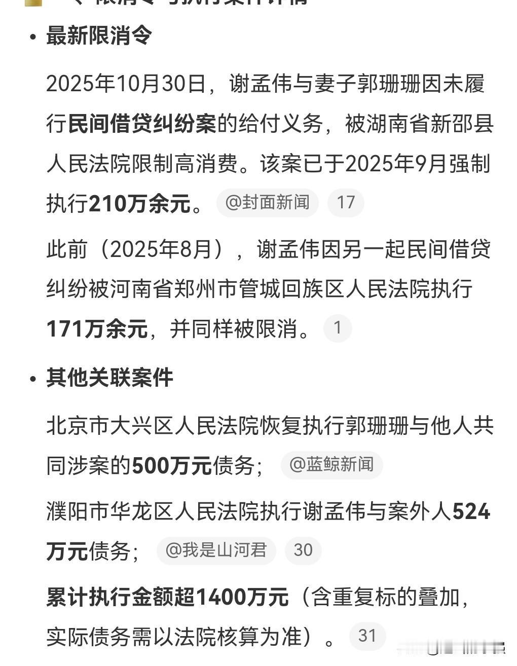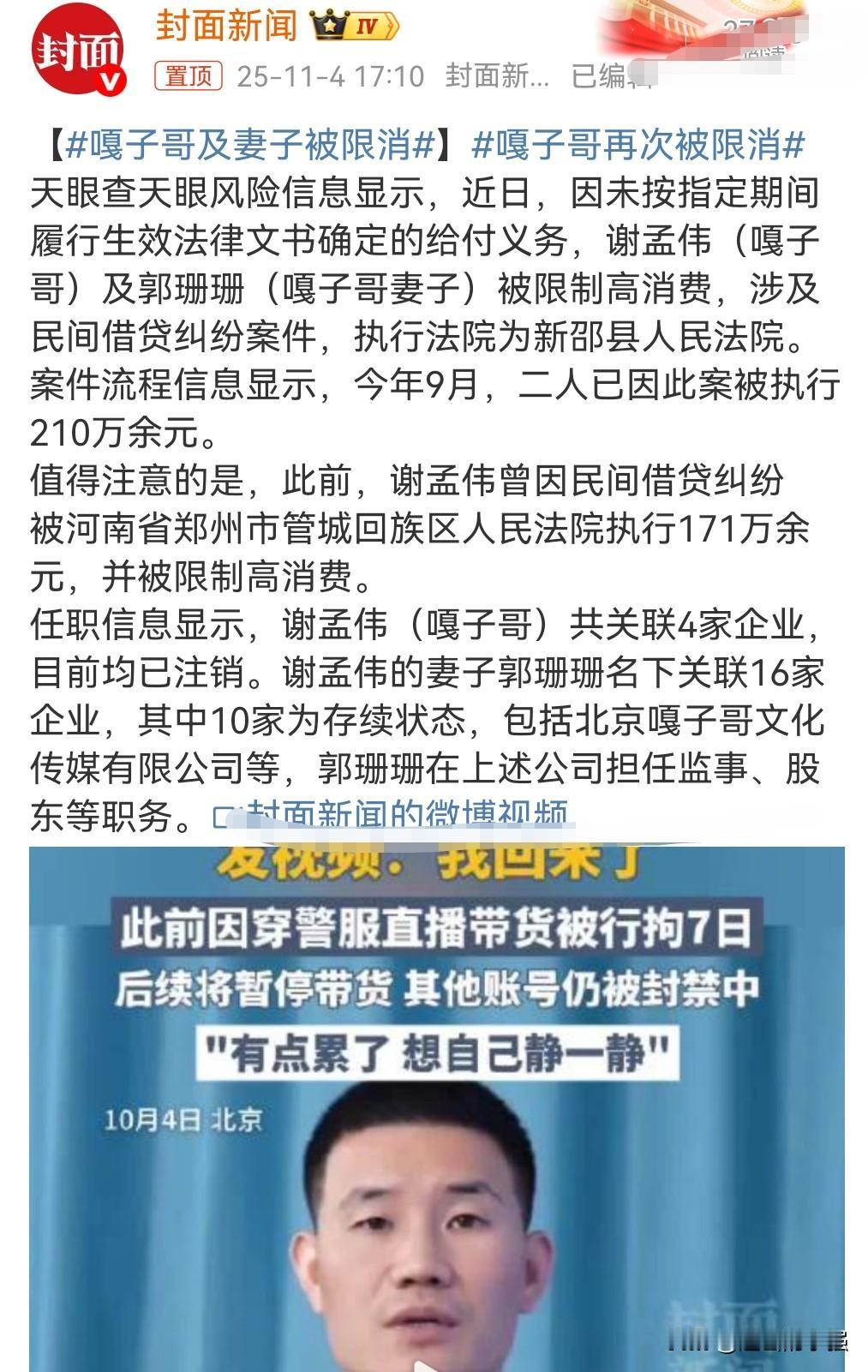 嘎子谢孟伟和妻子又被限制高消费了。 到底是什么情况啊? 看来这该给的钱还是要给啊,要不然的话被限制高消费也不是什么好事啊。 近日,听说他要开明星喜乐会,结果被取消了。 这真是敲响了警钟啊,做人以立品为先。