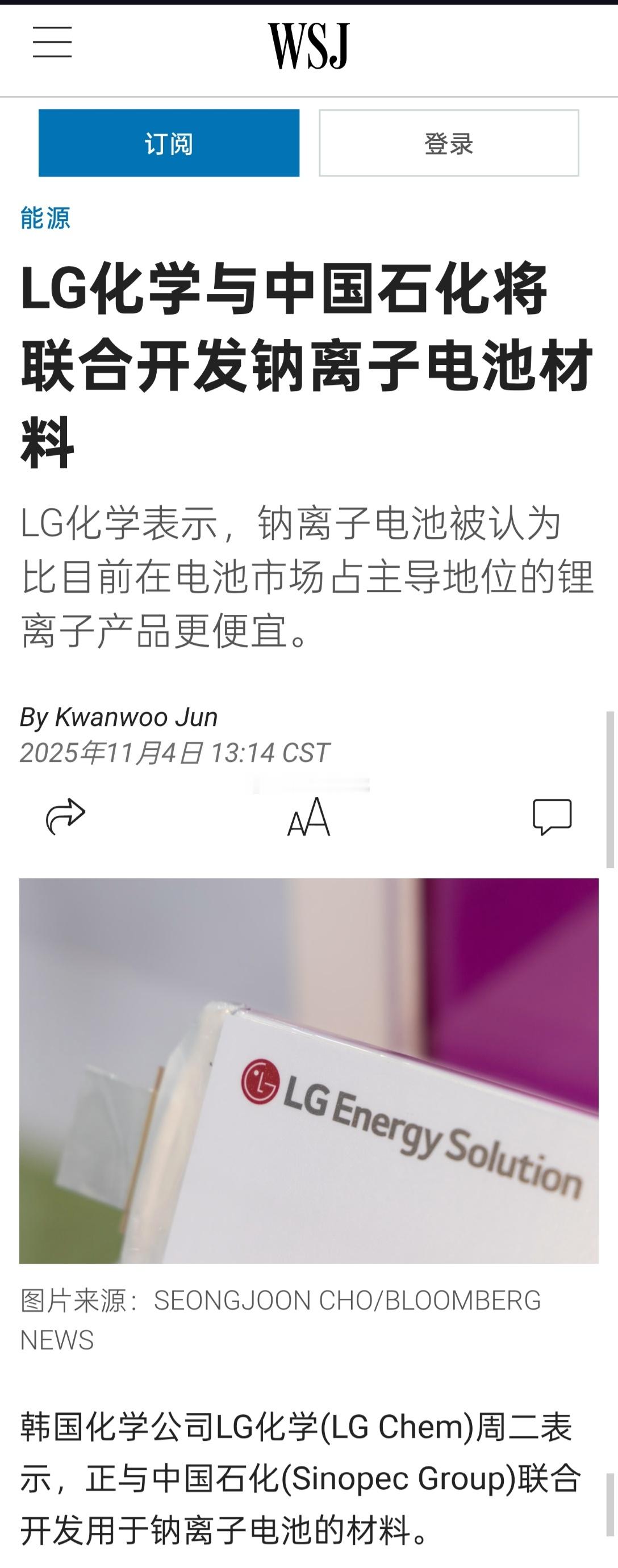 韩国化学公司LG化学周二表示,作为电池制造商LG新能源的母公司,该公司于10月30日与中国石化签署了一项协议,双方拟联合开发用于钠离子电池的正极和负极材料。LG化学表示,钠离子电池被认为比目前在电池市场占主导地位的锂离子产品更便宜。