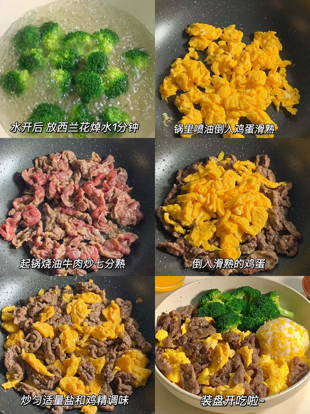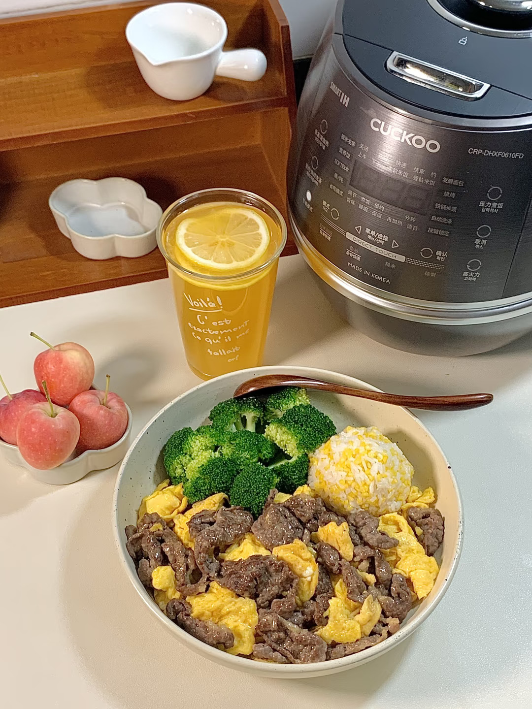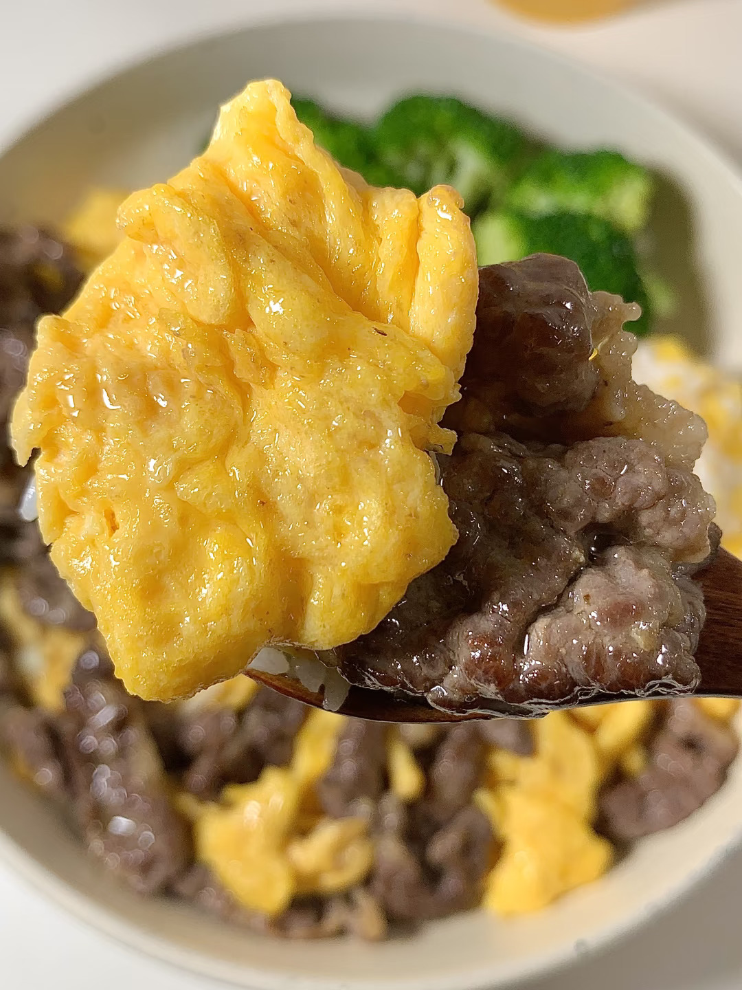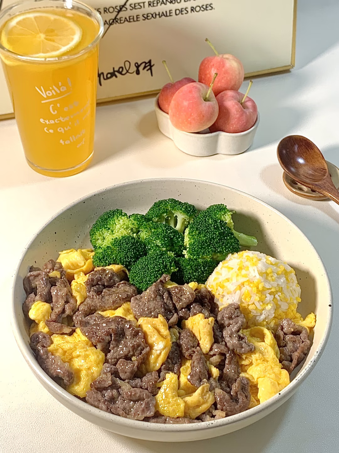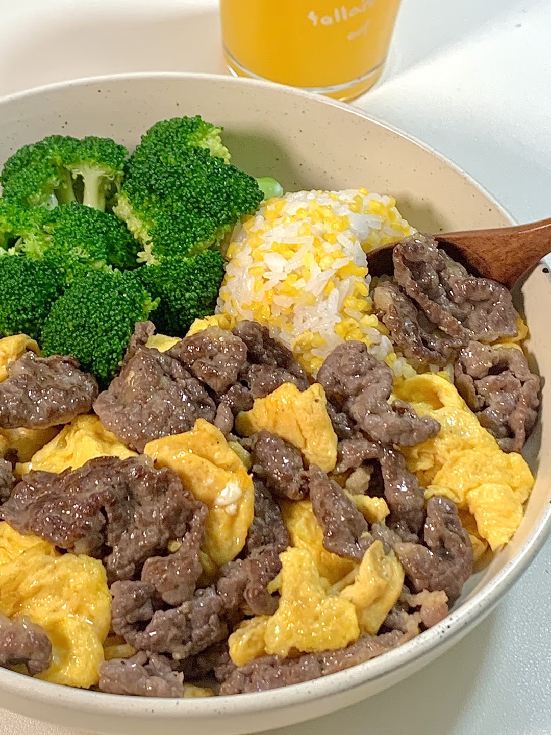 📝食材:牛肉(牛肉脊)、鸡蛋、西兰花、玉米饭