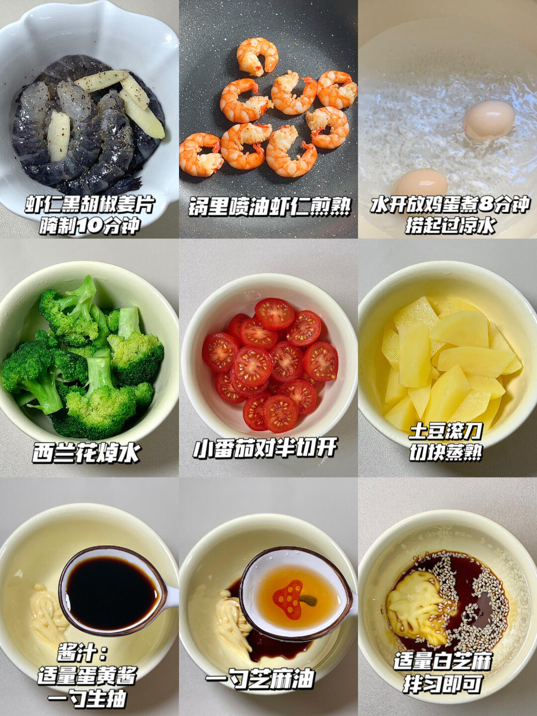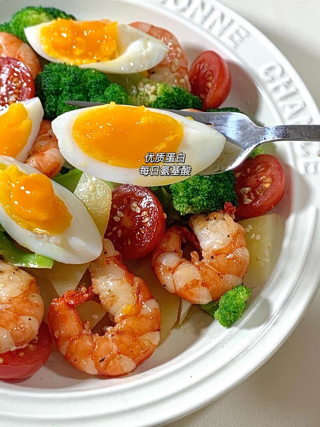 2️⃣锅里喷油虾仁煎熟,水开放鸡蛋中小火煮8分钟捞起过凉水 西兰花焯水2分钟