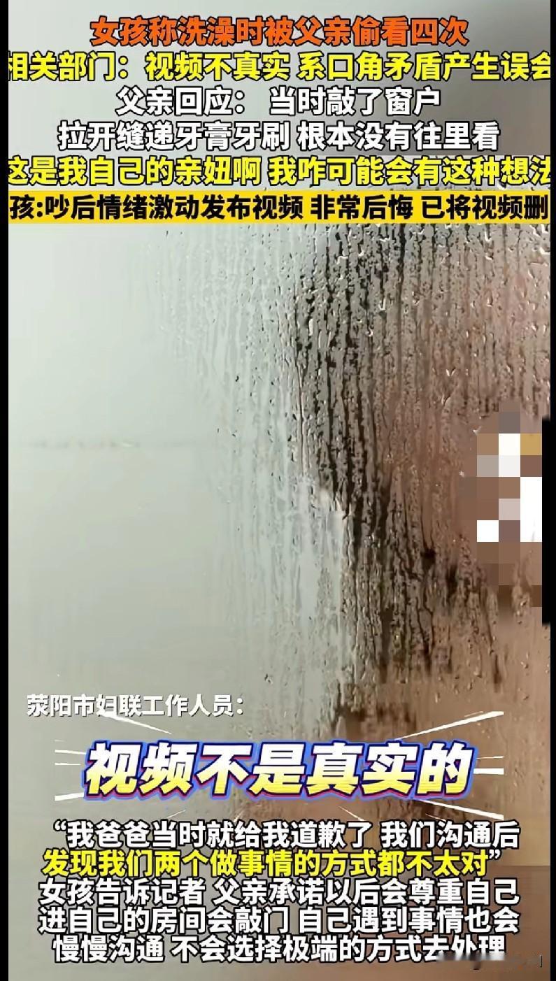 “哎,这事儿反转得让人松口气! 之前传女孩洗澡被父亲偷看四次,闹得沸沸扬扬。结果相关部门一查,是口角矛盾闹的误会。爸爸说就只是递个牙膏牙刷,“自己亲妞咋可能有那想法”;女孩也后悔了,说当时情绪激动发视频,现在父女俩沟通好了,爸爸还承诺以后会尊重她,进房间先敲门。 咱就说,家庭里的矛盾啊,还真得好好沟通,别一冲动就把事闹大。还好这误会解开了,也给大家提个醒:遇到事儿别急着下结论,好好聊聊才是正解~”