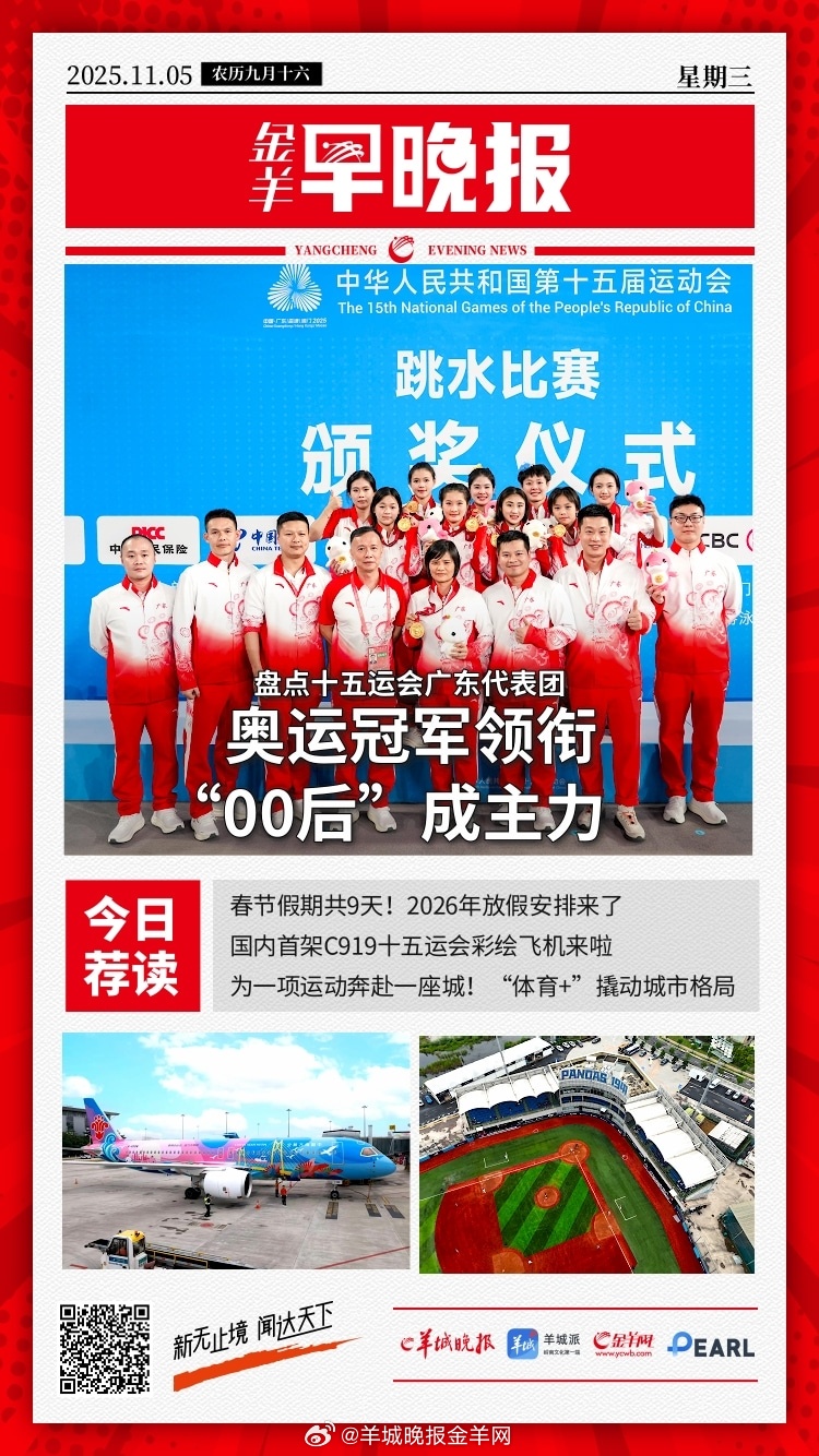 #金羊早晚报# 盘点十五运会广东代表团:十位奥运冠军领衔,“00后”成绝对主力; #2026春节放9天假# 春节假期共9天!2026年放假安排来了;成人健康体检“新国标”出炉;50种易倒卖回流医保药品纳入智能监管;“大美湾区”号首航!国内首架C919十五运会彩绘飞机来啦;学校食堂卖帝王蟹引发关注,校方:已对现有菜式进行调整;20岁中国女生东京失联27天,当地志愿者呼吁:需要大家的帮助;从概念蓝图到千亿级规模,广东低空经济具象化了;因停业超1年,韶关南岭国家森林公园4A级旅游景区资质被取消; #KK园区2年扩大3倍# 卫星探秘缅东妙瓦底:KK园区两年扩大3倍,周边十几个园区仍照常运转;美政府“停摆”影响航空业,美交通部长:情况会更糟。 #跳绳是减重排行榜第一名的运动# 更多精彩报道,请扫码关注羊晚全媒体报道!