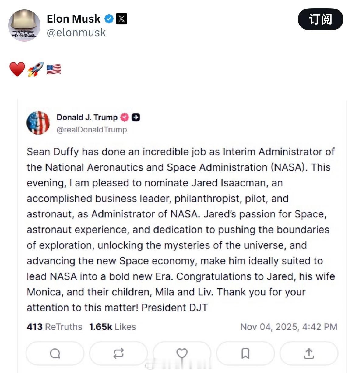 “肖恩·达菲作为美国国家航空航天局(NASA)的临时局长,工作出色。今晚,我很高兴提名贾里德·艾萨克曼担任 NASA 局长。贾里德是一位杰出的企业家、慈善家、飞行员和宇航员,他对太空的热爱、宇航员的经历以及致力于探索边界、揭开宇宙奥秘和推动新太空经济的决心,使他成为领导 NASA 迈入一个大胆新时代的理想人选。恭喜贾里德、他的妻子莫妮卡以及他们的孩子米拉和利夫。感谢大家对此事的关注!特朗普总统”