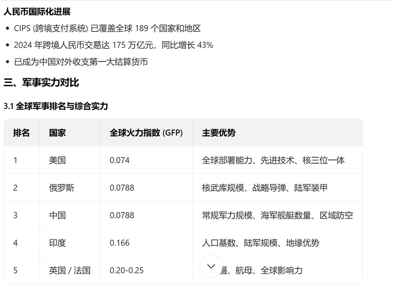 我们一定要清楚的认识中国的各方面实力!! 现在网络上有太多的无脑赞,中国这也好,那也好,美国这不好,那不好!当然,我不洗白美国,美国这么多年做的事,大家都是有目共睹。但我们更不能盲目的自信,盲目的崇拜。 要实事求是,要以客观的态度去看待中美之间的实力差距。不要被网络上过于娱乐化的内容左右。
