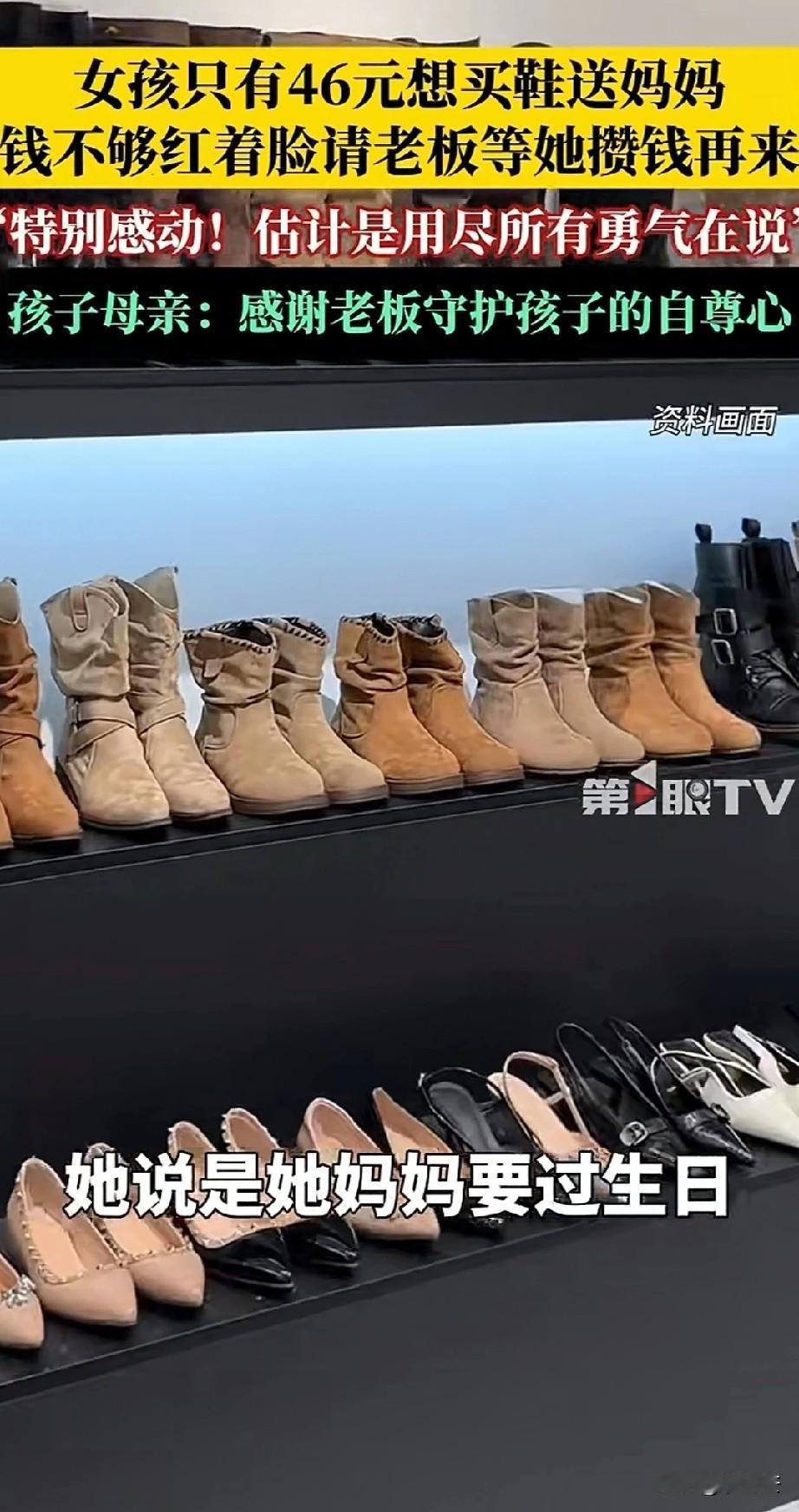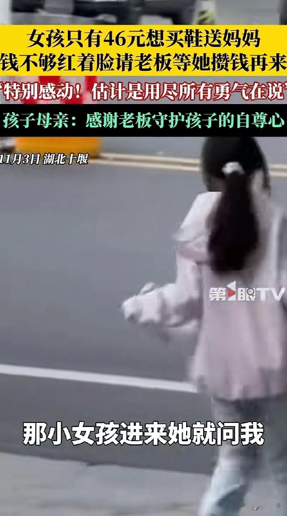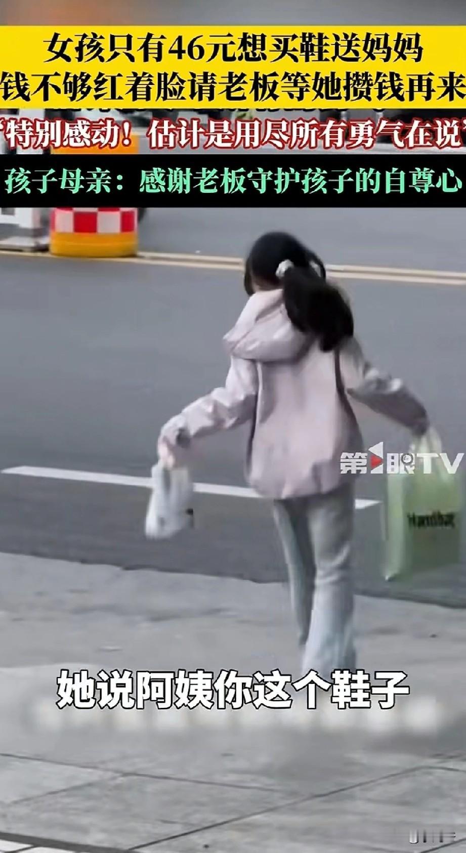 “懂事的小棉袄!”女孩浑身凑了46元去给妈妈买生日礼物,仔细的挑了一双靴子,反复试了好几次。因为带钱不够,脸色窘迫的和店主商量,“阿姨,可不可以帮我把鞋子留几天,我凑够了钱就来买!”店主感动不已,159的鞋子只收46元卖了,只为成全女孩的孝心! 湖北一店主发视频,一个小女孩进店就问,有没有她能买的起的鞋子,就不超过50块钱的,因为妈妈过生日,她想送妈妈一双鞋。店主就让她自己选。 她给妈妈选了一双加绒靴子,还自己试了好几回,鞋底硬不硬,走路舒不舒服。后来拿起鞋子看到了鞋底的价格,小姑娘站在那犹豫了很久,把鞋子放了回去。 然后走到店主面前,很小声谨慎的说,阿姨,那双鞋子可不可以给我留几天,等过凑够了钱就来买!因为她全身只有46元,那而双鞋是159! 女店主耐心听完小女孩的话,女孩脸特别红,声音特别小,用尽了所有的勇气来说这件事。店主十分感动,只收了46元就卖给了她。女孩走的时候脸还是很红,但是蹦蹦跳跳的拿着鞋子,十分开心。 事后妈妈也在店主视频下评论,感谢店主守护了女儿的自尊心,妈妈说女儿比较腼腆,平时很社恐,也很惊讶女儿能做出这么感动的事。 可能在女儿看来,虽然自己不善言辞,不敢与大人交流,但是为了妈妈的鞋子,可以鼓起所有的勇气。 女店主支持了女孩的孝心,更保护了她的自尊心,这件事也会让女孩记好久,以后会有更多的勇气做事情。 倘若当时女店主直接把她赶出来,或者没有钱就不买,训斥小女孩,估计她很久都不敢再和大人交流,也不敢勇于表达自己的想法。 比更46元的鞋子,更值得赞扬的是女店主没有因为她是一个小孩子就忽视她,反而细心的保护了女孩的自尊,这将是童年世界的一道光,滋养萌生出的勇气!