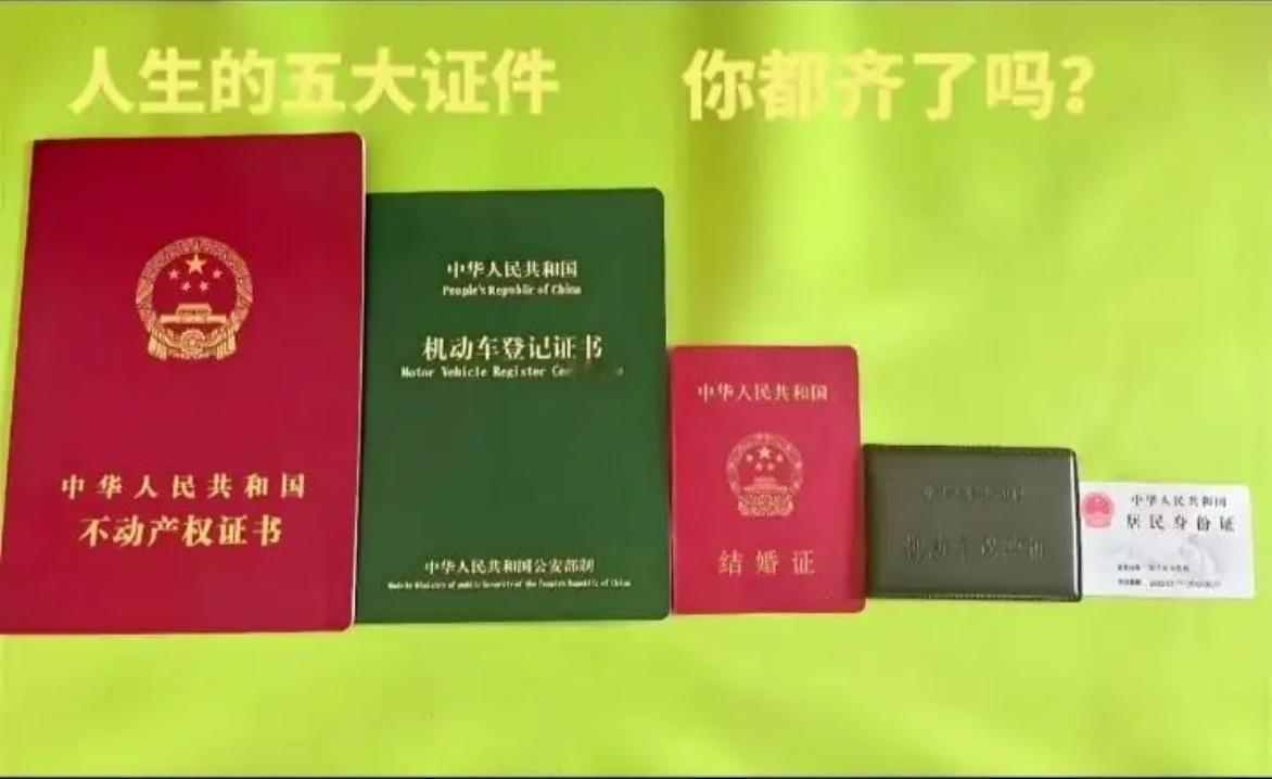 人生的五大证件,你都集齐了吗? 身份证,是你存在这个社会的数字图腾。 驾驶证,赋予你驾驶汽车的资格。 结婚证,标志着人生中的头等大事。 机动车登记证,让你能想去哪就去哪。 不动产权证,为你打造温馨的避风港湾。