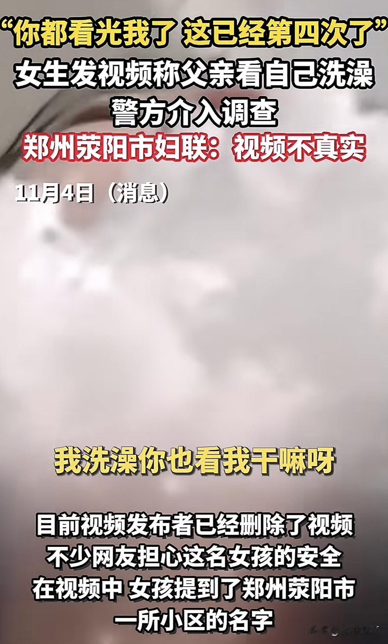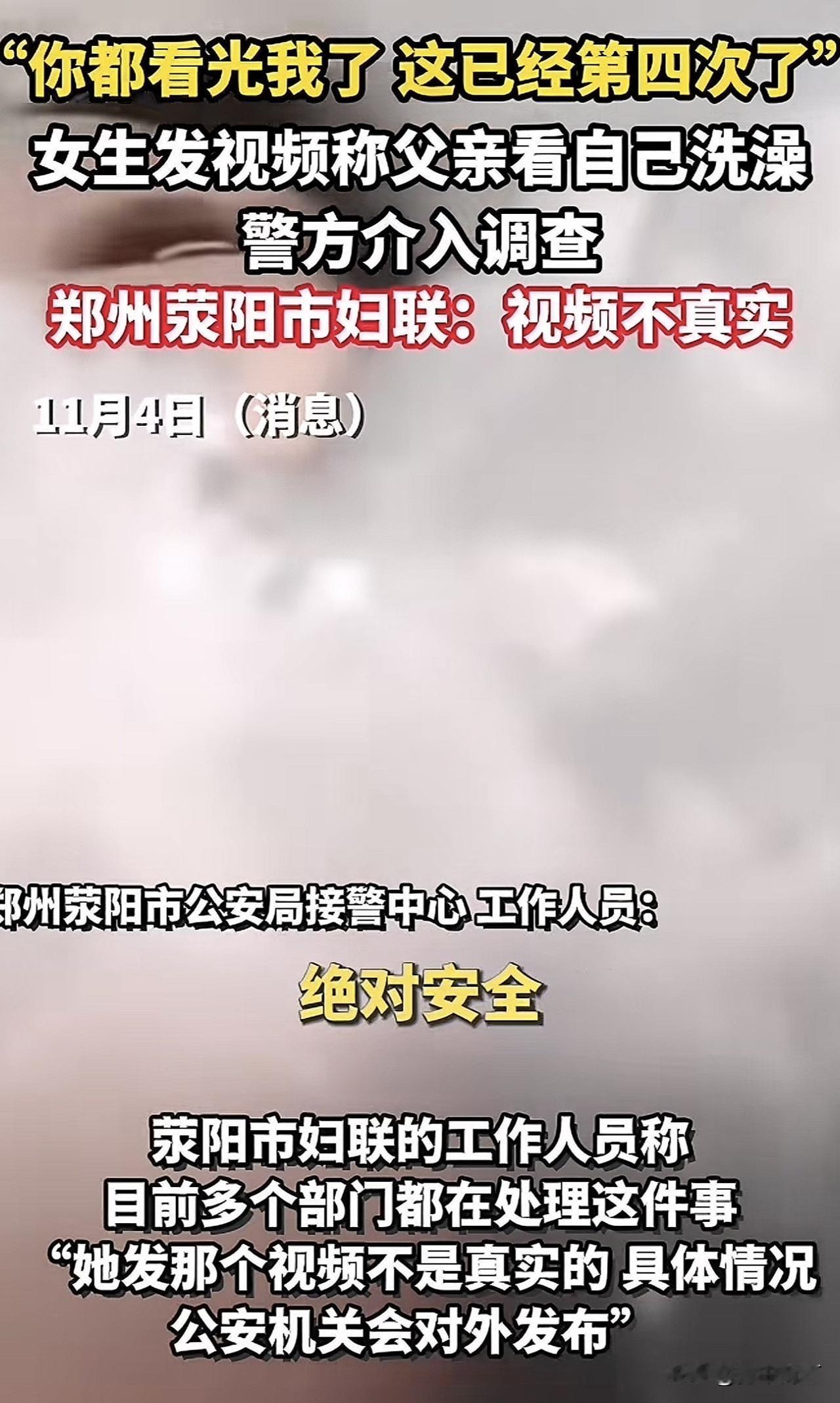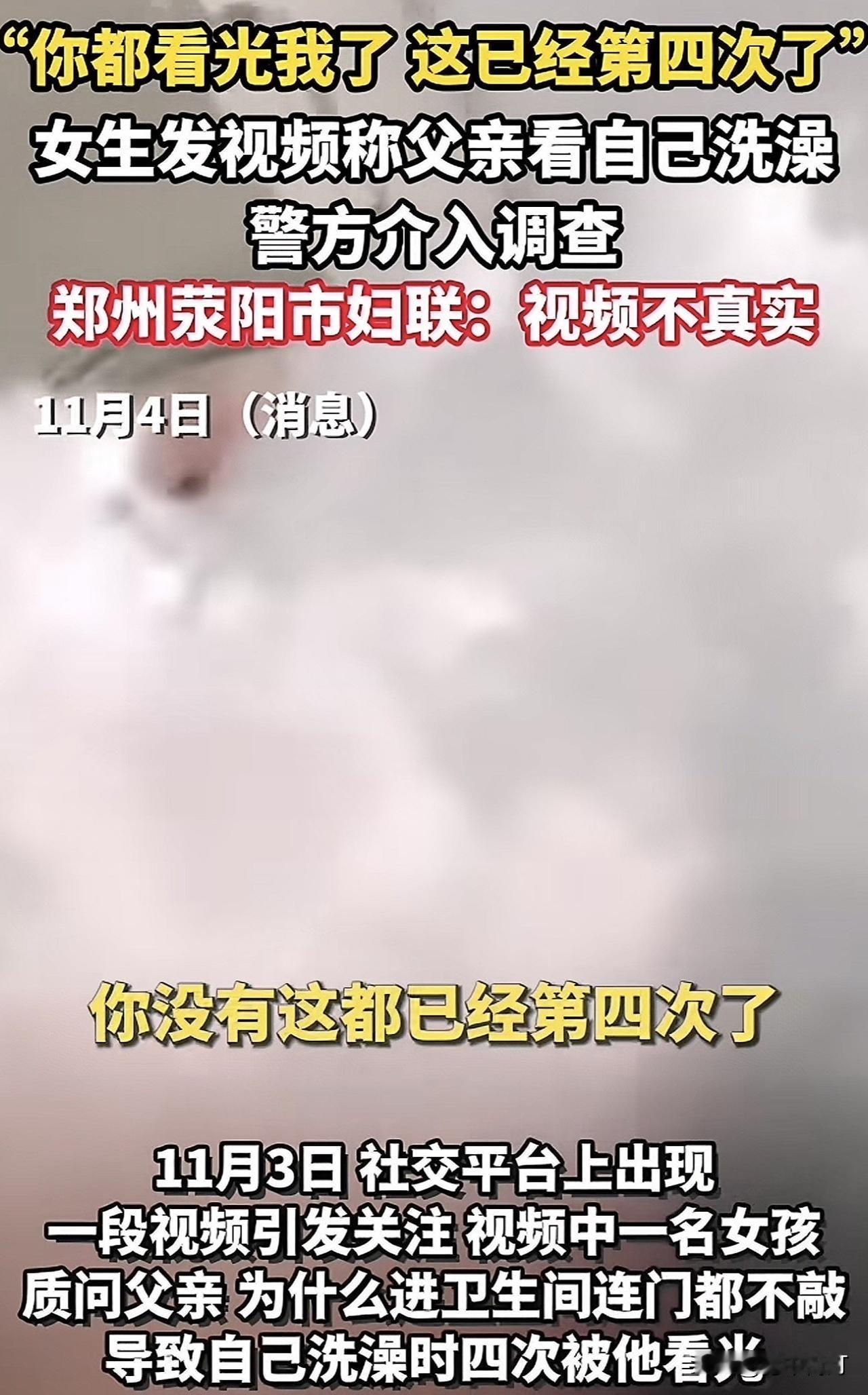 惊讶!!!父亲偷看女儿洗澡!女孩控诉父亲看洗澡事件突然反转,妇联给到回应。 女孩控诉父亲在自己洗澡时四次闯入卫生间的视频近日引发全网关注,警方迅速介入调查确保女孩安全。然而事件在11月4日出现反转,荥阳市妇联工作人员明确表示:她发那个视频不是真实的。 11月3日,一段家庭冲突视频在社交平台疯传。 视频中,一名女孩情绪激动地质问父亲为什么进卫生间连门都不敲,导致自己洗澡时四次被他看光。 面对女儿的控诉,父亲暴怒回应:恶心就恶心,我看你干啥!母亲则在旁附和,认为进女儿房间应该敲门。 视频迅速发酵,网友担心女孩安全,有人甚至为此报警。 11月4日,郑州荥阳市公安局接警中心工作人员向媒体确认,民警已介入调查,并见到了小女孩和她的父母。 警方特别强调,孩子的安全绝对可以放心。 与此同时,荥阳市妇联的工作人员也作出回应,明确表示视频内容不真实,并透露多个部门正在协同处理此事。 妇联的不实认定让事件出现巨大反转。 原发布者已删除视频,这一举动更加引发网友猜测。 有媒体进一步报道指出,父亲已向女儿道歉,女儿也承认自己因情绪激动发布了视频,现在非常后悔。 事件曝光后,网友态度出现明显分化。 一部分网友直呼被打脸,刚心疼完女孩,结果却是假的,感叹同情心被当成了流量密码。 另一部分人则持怀疑态度,认为视频中母女都在陈述,不明白为何被认定为不真实。 家庭监控本为守护安全,却屡屡成为网络热点,当一个个家庭冲突被制成“爆款视频”时,我们或许更该思考:什么才是真正值得被传播和关注的内容。