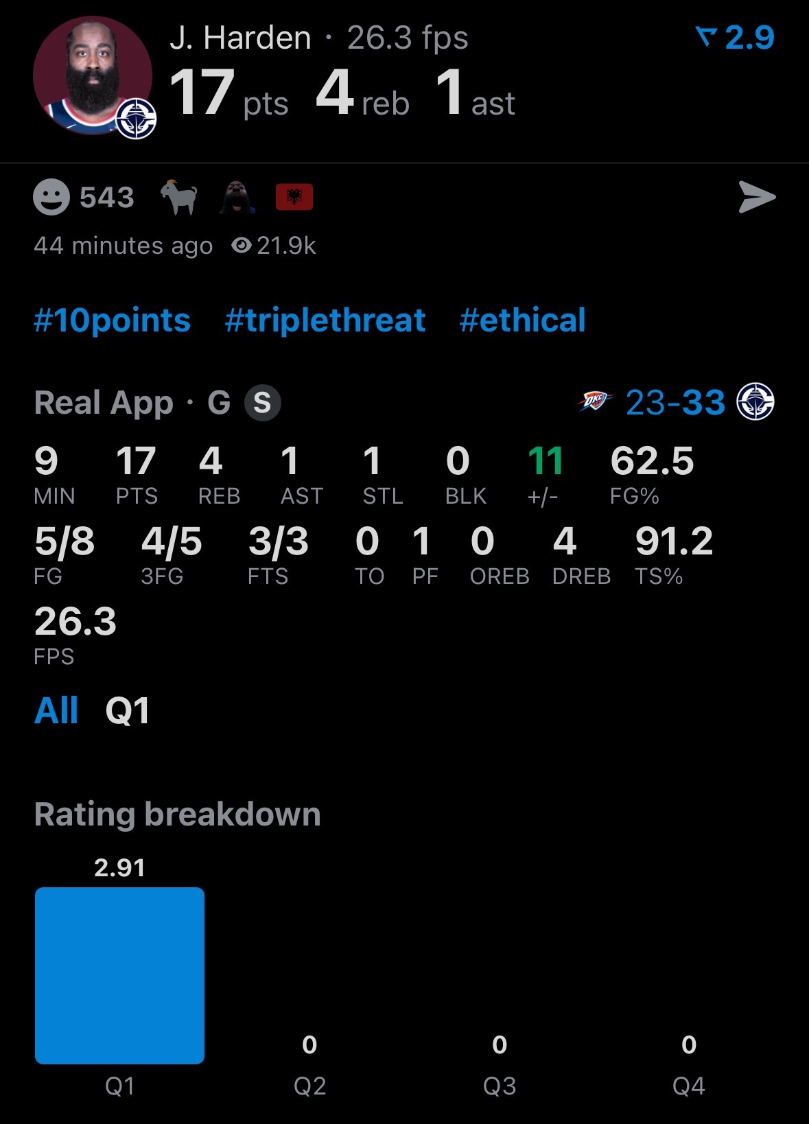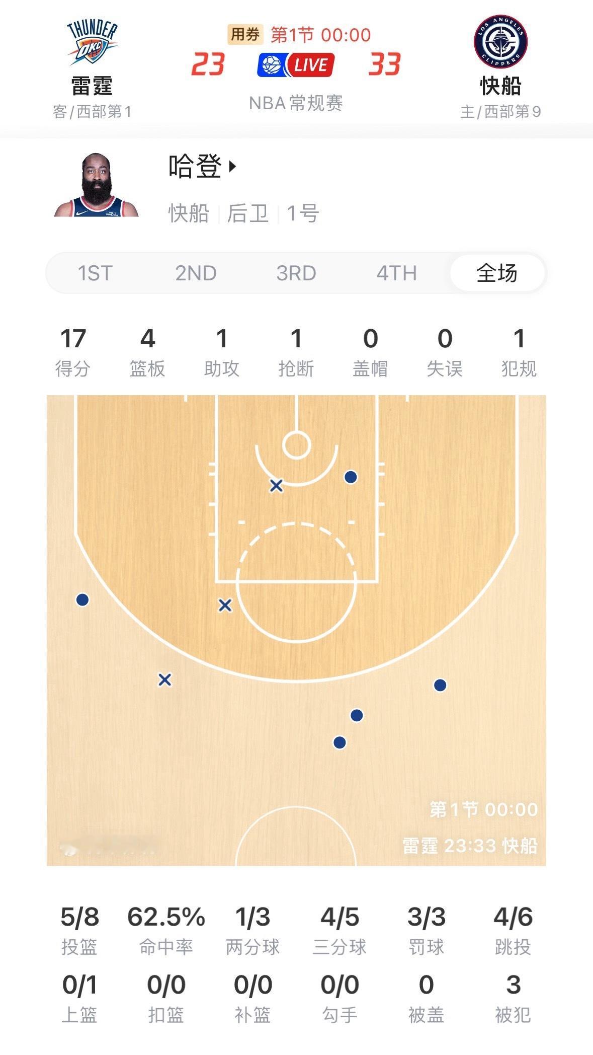 哈登首节状态不错,得到17分。快船领先雷霆10分。