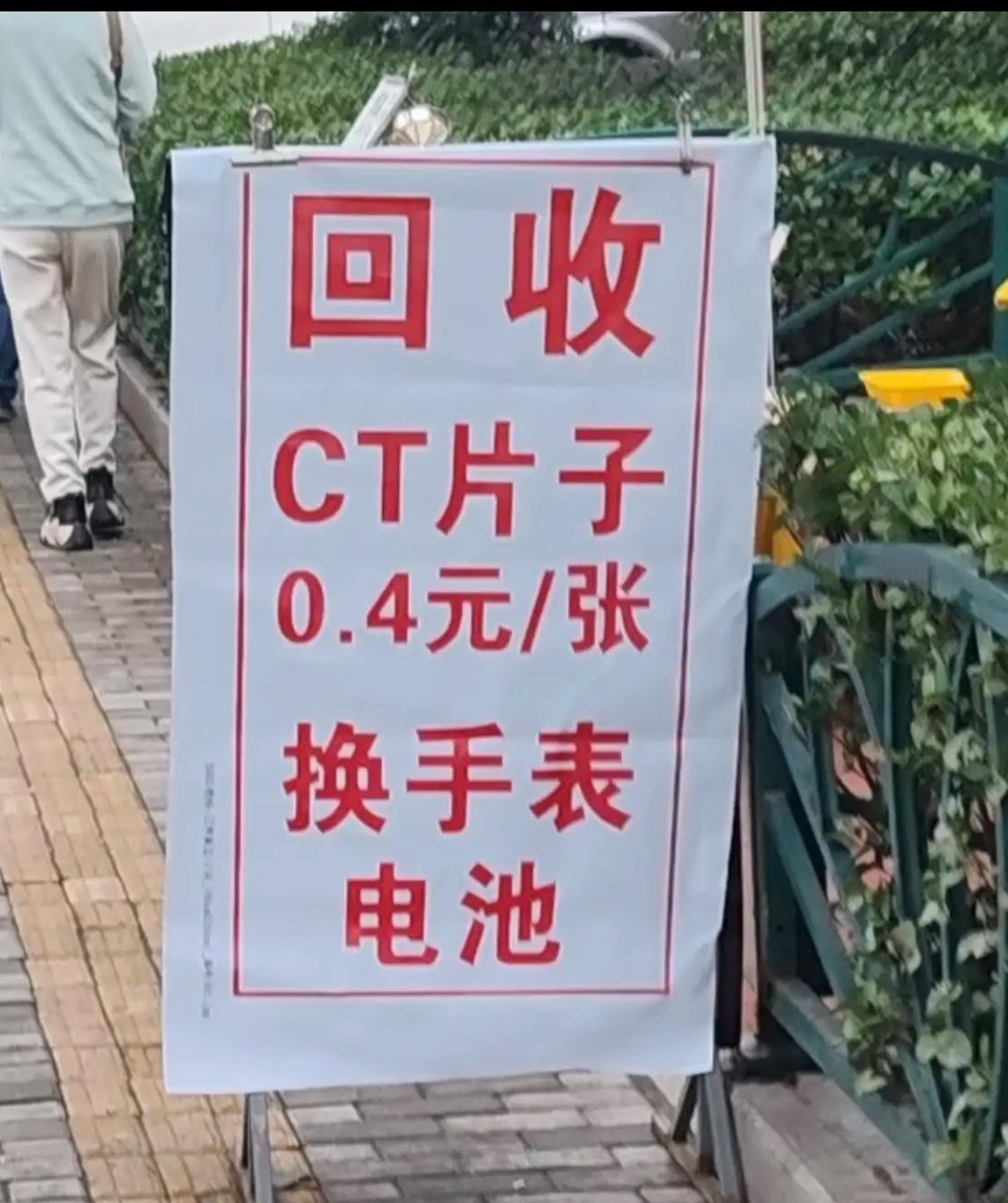 今天在医院旁边看到一个牌子,牌子上写着回收CT片子,一张4毛钱。医院现在好像打印CT片子也要额外收费,之前家里有几张,也不知道能换钱,全都当垃圾扔了,不就是一张塑料片子吗?也不知道回收这个东西能干啥,难道还能重复利用?