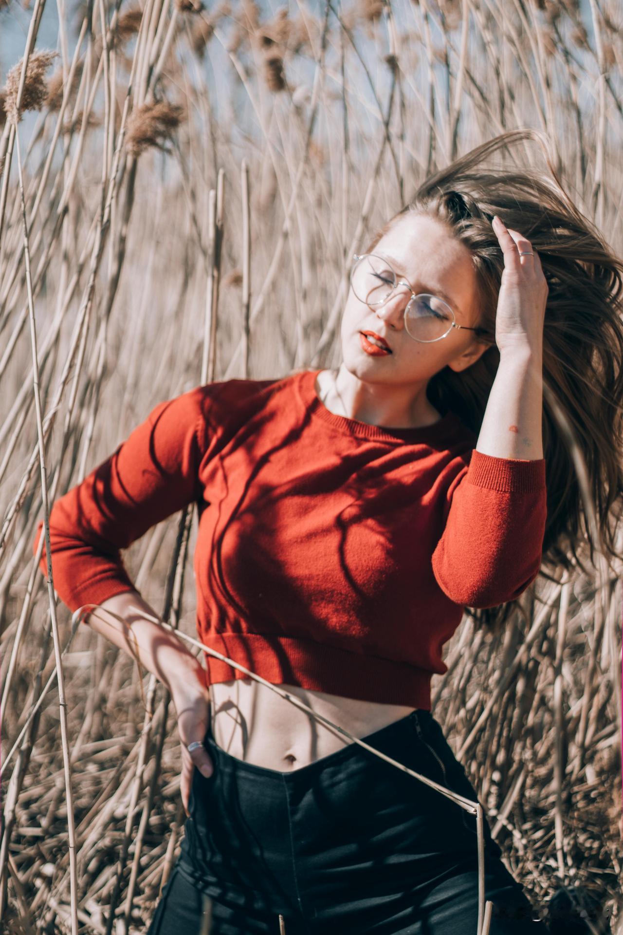秋日田野,红衣少女,微风轻拂,梦幻瞬间。