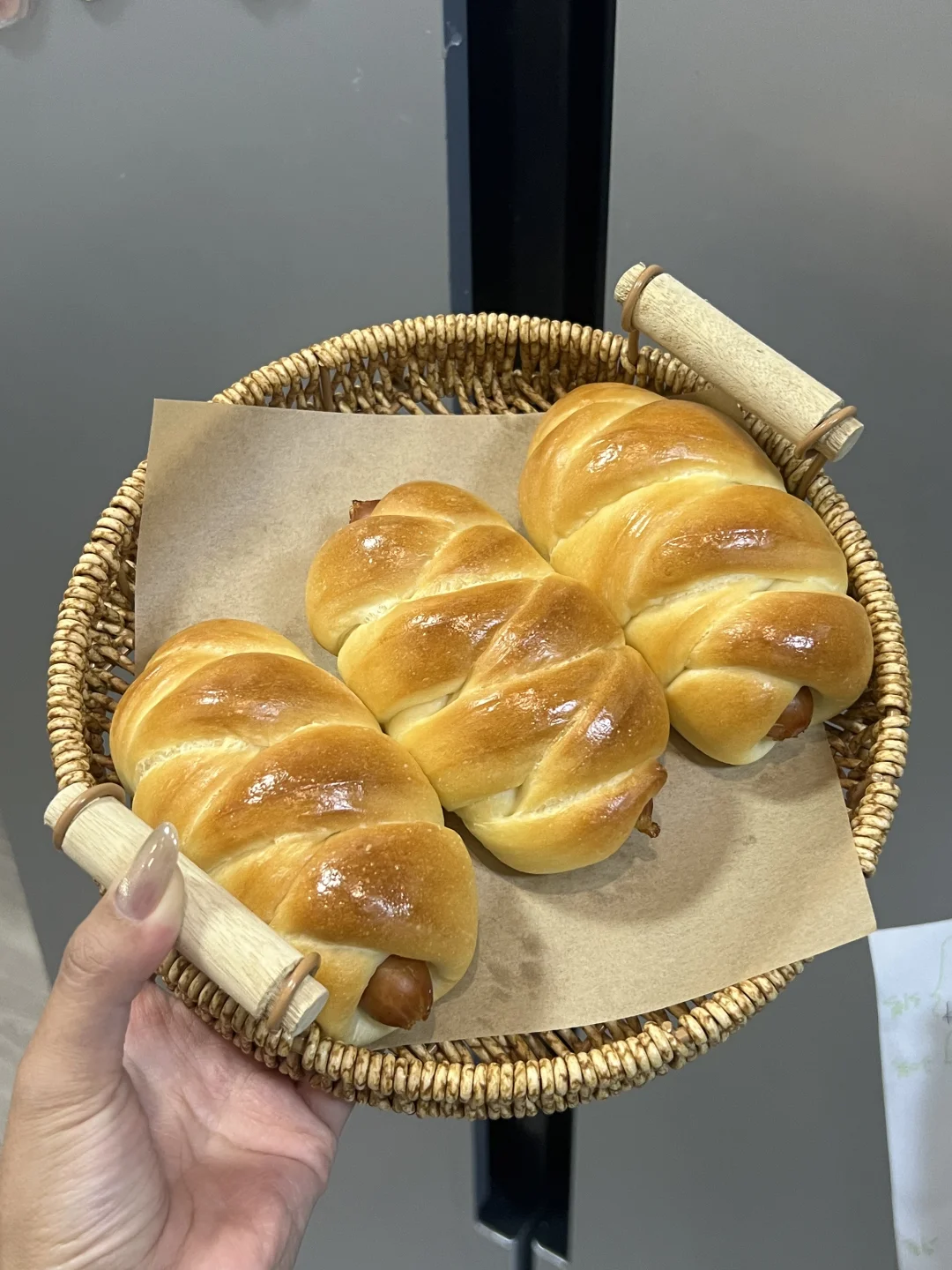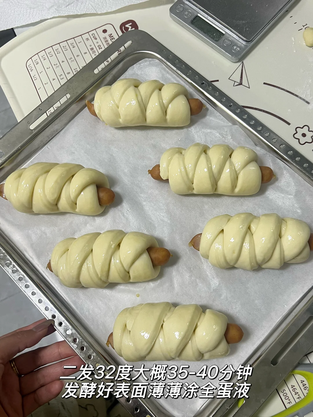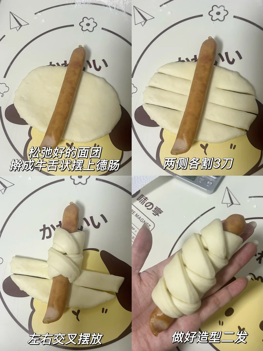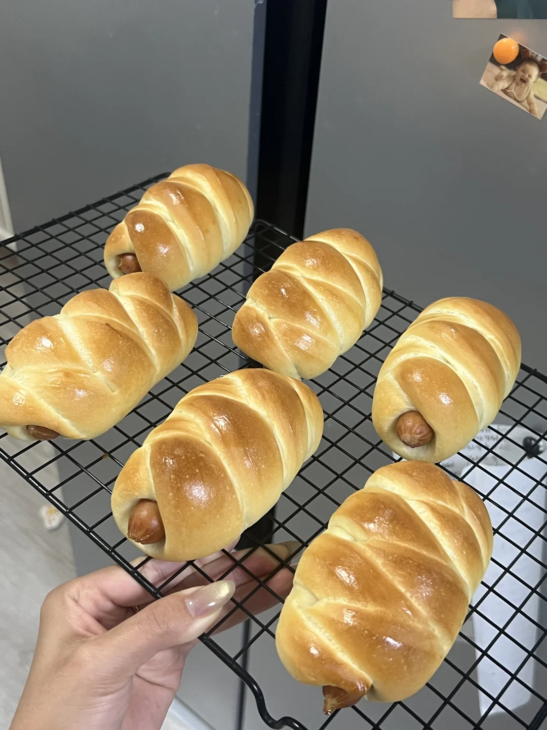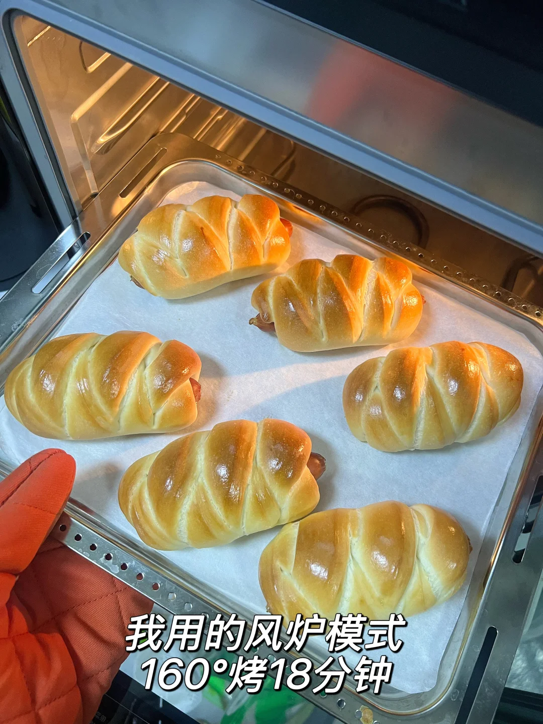 是我!!!是我!!!! 第一次尝试花式造型, 太好看了嘿嘿嘿 ✅食材(8个) 高筋粉250g、冰牛奶150g、全蛋液35g、细砂糖20g、高糖酵母2.5g、盐3g、黄油20g 德肠8根 —— 我这次用的风炉160度18分钟,平炉的话180度18分钟,上色满意以后盖锡纸
