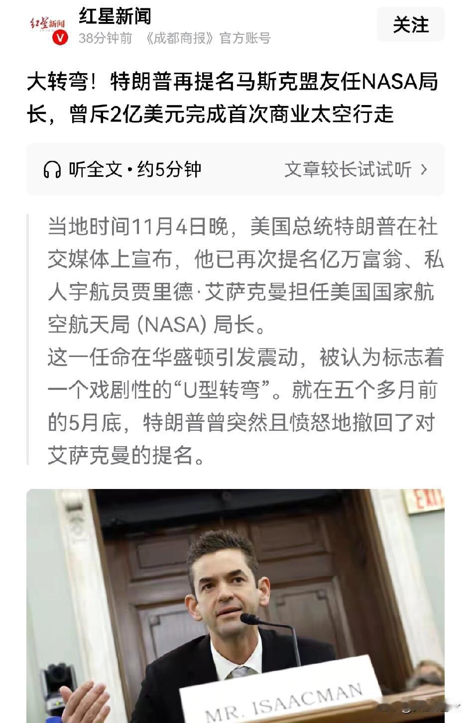 特朗普再次打自己的脸!昨晚特朗普宣布再次提名亿万富翁、著名私人宇航员贾里德•艾克萨满担任美国国家航天局(NASA)局长,你没看错,就是那个今年5月份被特朗普撤销提名资格的马斯克亲密盟友。 今年5月份特朗普说联邦选举委员会记录显示贾里德•艾克萨满曾向美国民主党选举委员会捐款,本来这种情况在美国司空常见,但是这时候正值马斯克和特朗普大吵大闹的关键时刻,所以也就是5月底马斯克辞去了美国“政府效率部”委员会的职务,导火索正是马斯克与特朗普因“庞大而美丽法案”而公开争执,据悉这项法案停止了美国电动车补贴政策。 现在特朗普已经和马斯克重归于好,自然不会让他的盟友再受无妄之灾,这场闹剧看似在扇特朗普的脸,其本质正是利益之争,天下攘攘皆为利往,古人诚不欺我!