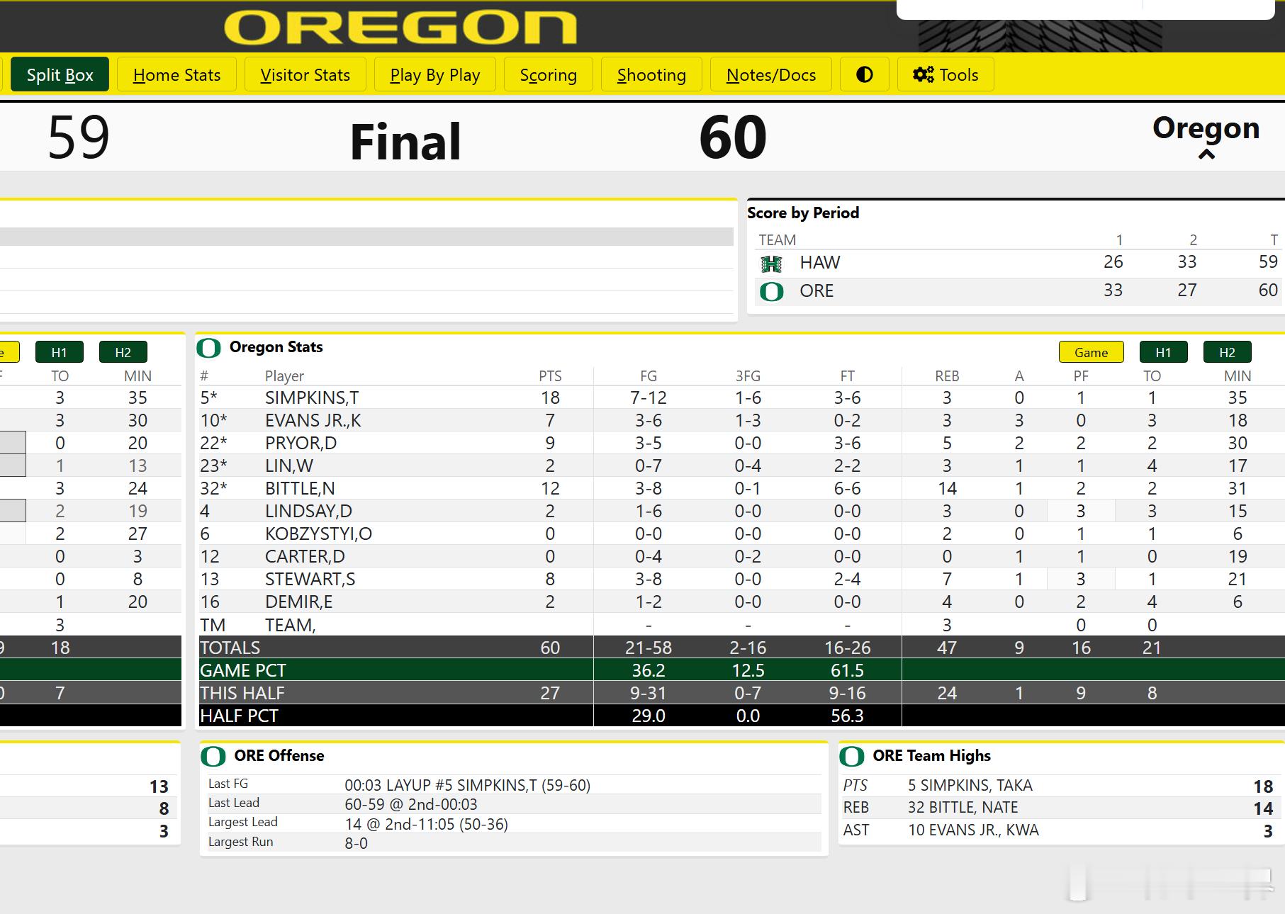 林葳今天的表现真是糟透了唉~,5号队友上篮绝杀帮助俄勒冈战胜夏威夷
