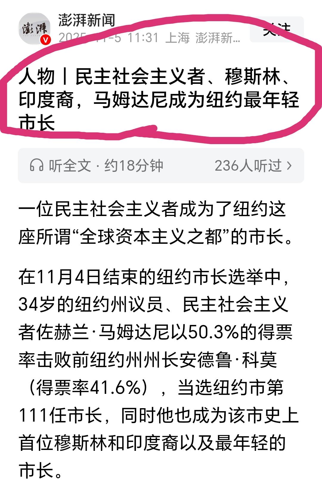又来看北美魔幻现实主义作品。这次是一个90后、穆斯林、民主社会主义者、印度裔、反鱿主义者成为美国最大城市纽约的新市长。 更魔幻的是税宗说他宁愿民主党人当选也不愿意马姆达尼当选,可见这个90后的能量有多大。 更更魔幻的是居然有众多的犹太人为他站台,甚至包括小索罗斯。[我想静静] 马克思那句关于资本卖绞索的话再次具象化了。[笑哭] 点右上角关注我,我们一起去看这个魔幻的世界