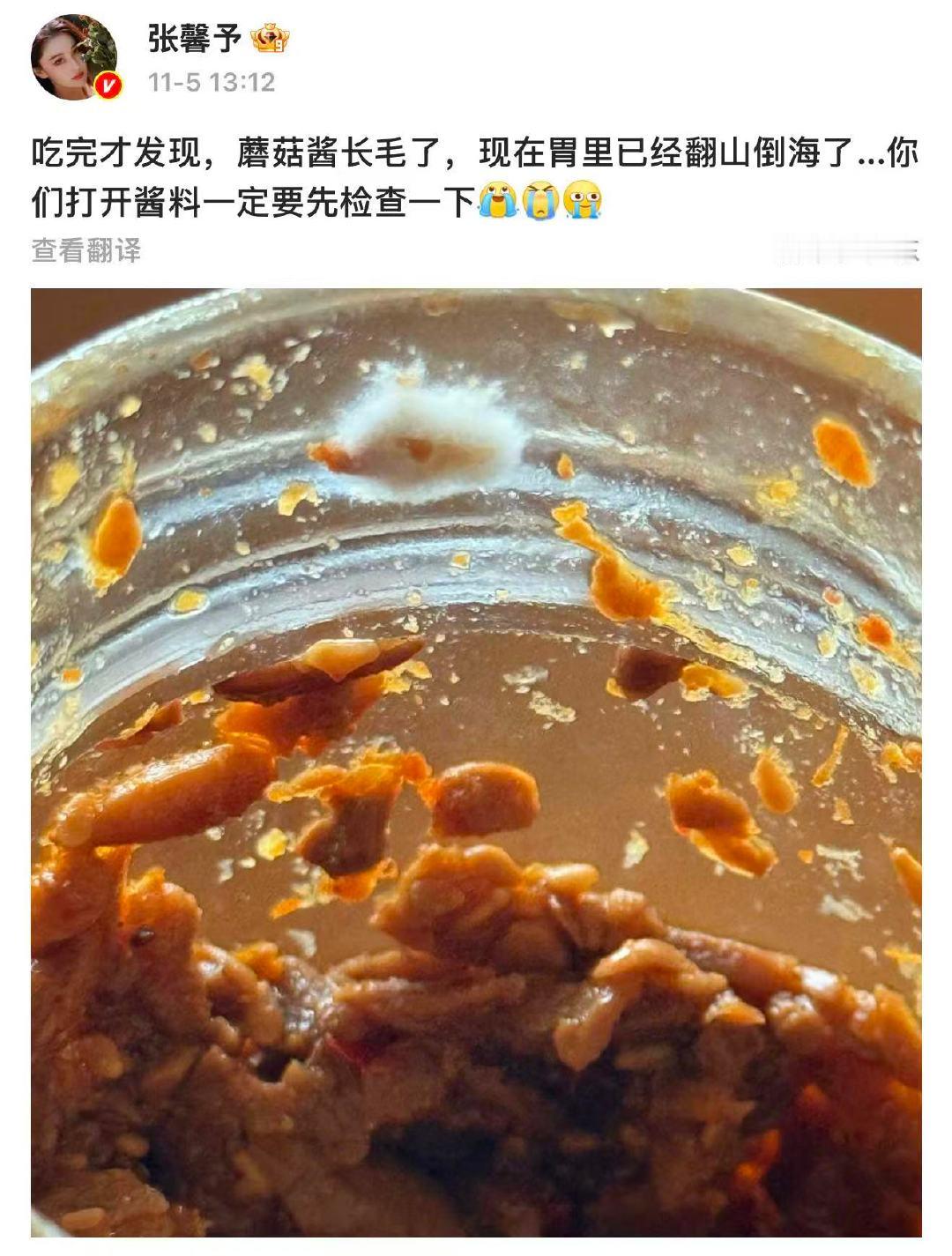 张馨予吃了长毛蘑菇酱张馨予提醒吃酱料前要检查 11月5日,发文称自己吃了长毛的蘑菇酱“吃完才发现,蘑菇酱长毛了,现在胃里已经翻山倒海了…你们打开酱料一定要先检查一下[泪奔][泪][苦涩] ”网友:吃酱料前一定要检查!