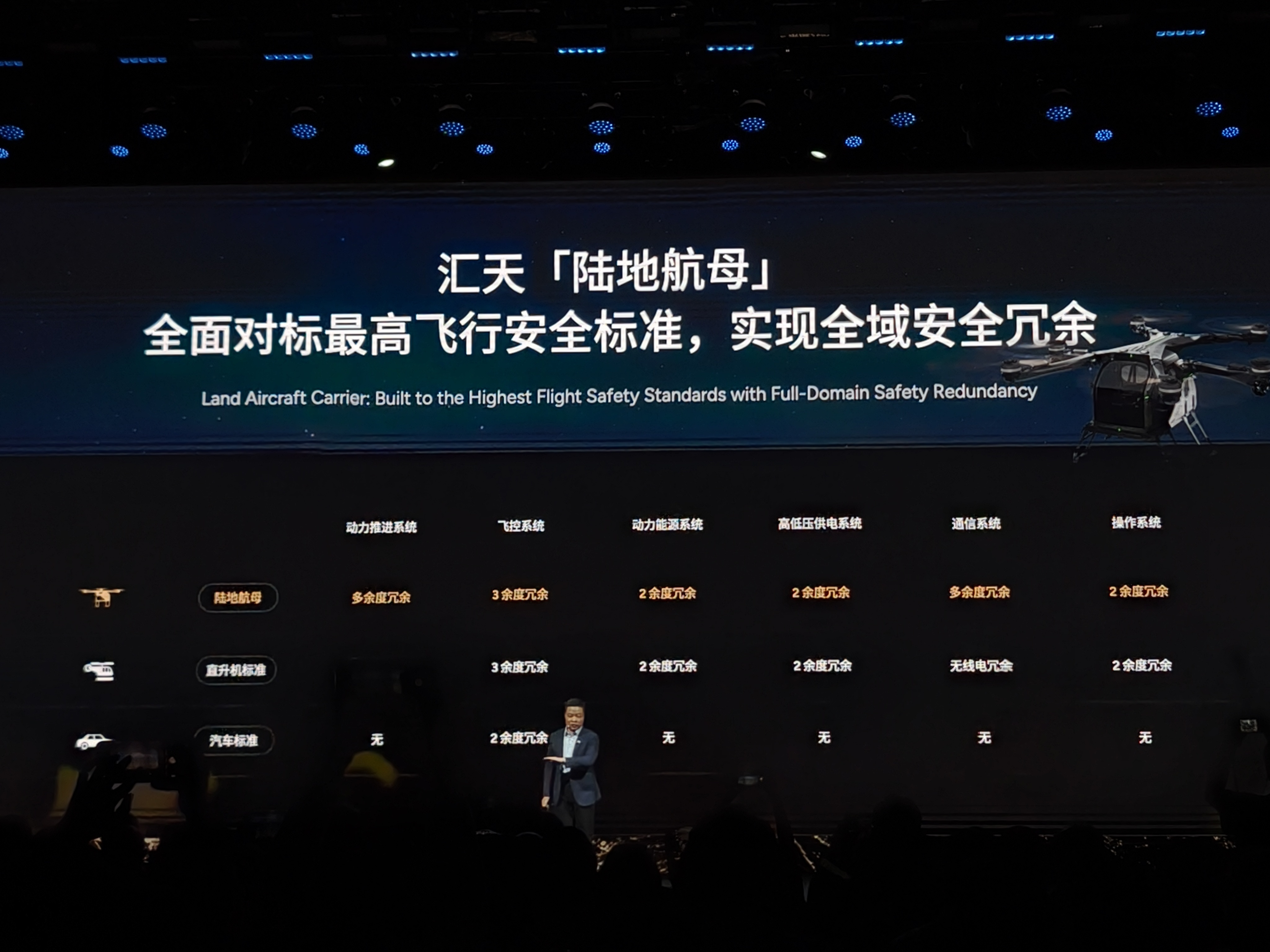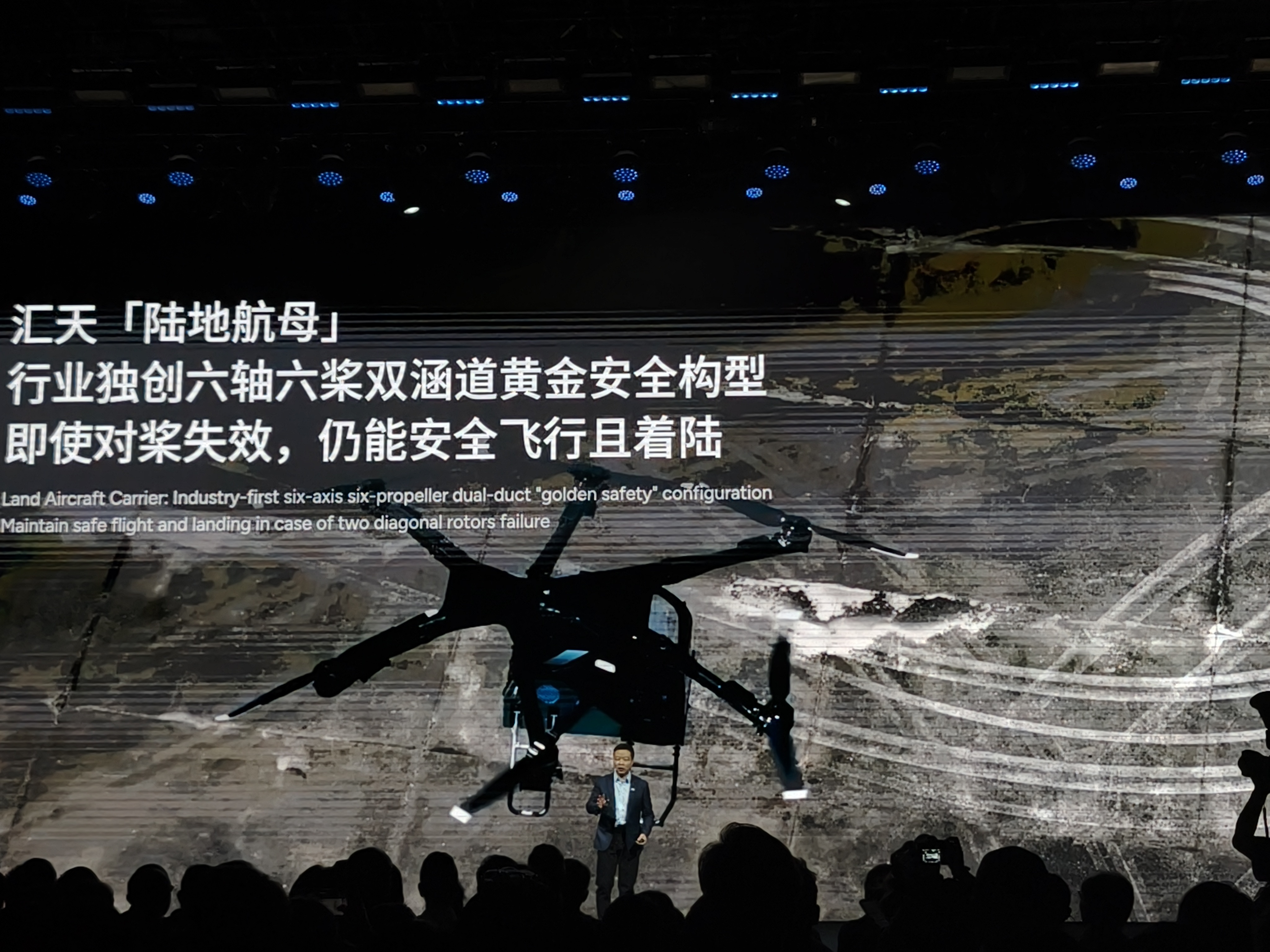 综合续航里程CLTC超过1000公里,全面对标最高飞行安全标准,实现全域安全冗余;行业独创六轴六桨双涵道黄金安全构型,即使对桨失效,仍能安全飞行且着陆。