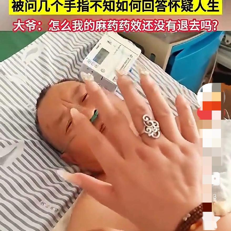 麻药劲儿还没过吗 大爷自己都怀疑人生了 刚做完手术,为了测试他的麻药劲过没过,一个六指姑娘故意伸手让他看。 但也刚开始说6个,后续好像觉得不可思议,揉了揉眼,又说5个,估计连他自己都觉得麻药劲没过,还迷糊着呢? 我有一个朋友,打麻药过后还说胡话,一直在那里说王者荣耀的内容,笑死我了。你身边有这些打完麻药之后的乐事吗?分享一下呗。麻药醒了好痛 拔针会疼吗 麻药后的感觉 麻药过敏 拔针会疼吗 手术后巨疼 麻药后的感觉 麻药过敏 麻药真疼 一针麻药 局麻打麻药疼吗