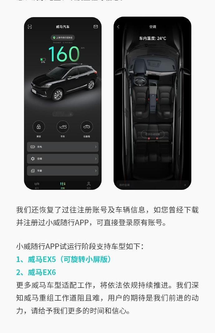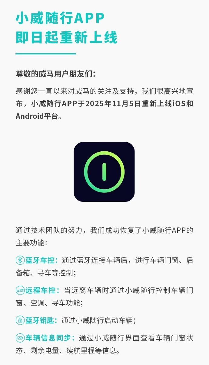 车若初见[超话] 威马APP重新上线,蓝牙车控、远程车控、蓝牙钥匙等功能也恢复了,对于老车主来说有总比没有好,留得青山在不愁没柴烧。