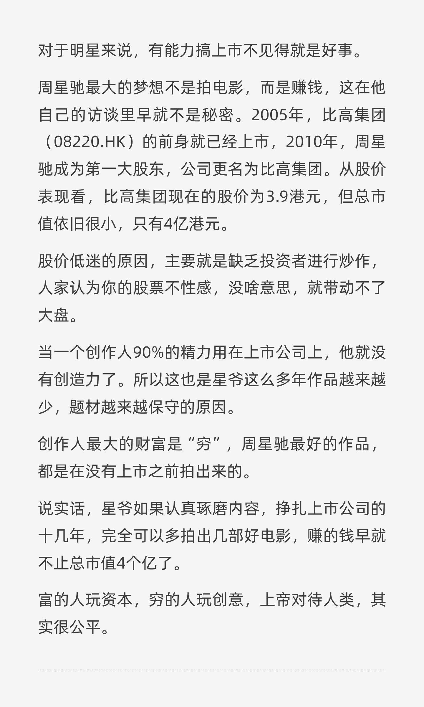 周星驰早就拥有自己的上市公司,但公司市值小,股价低迷。他将大量精力用于上市公司,导致创作减少,作品质量下降。周星驰最好的作品都是在未上市时完成的。